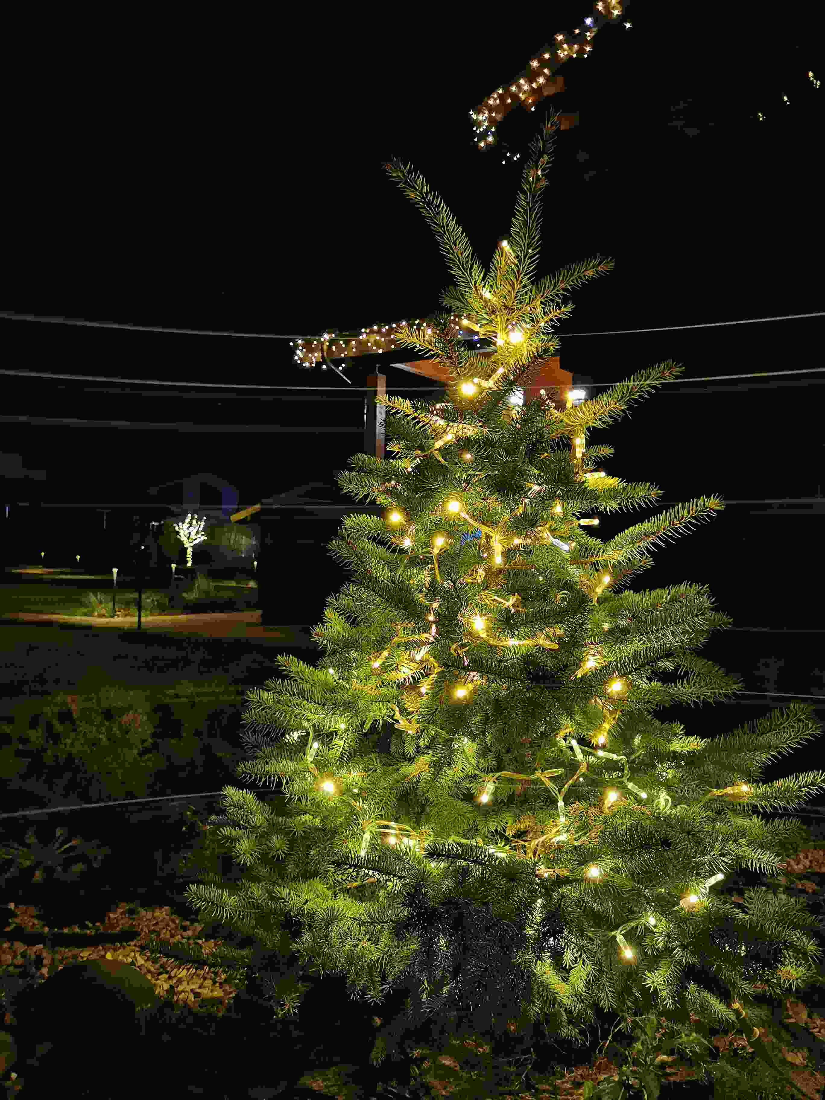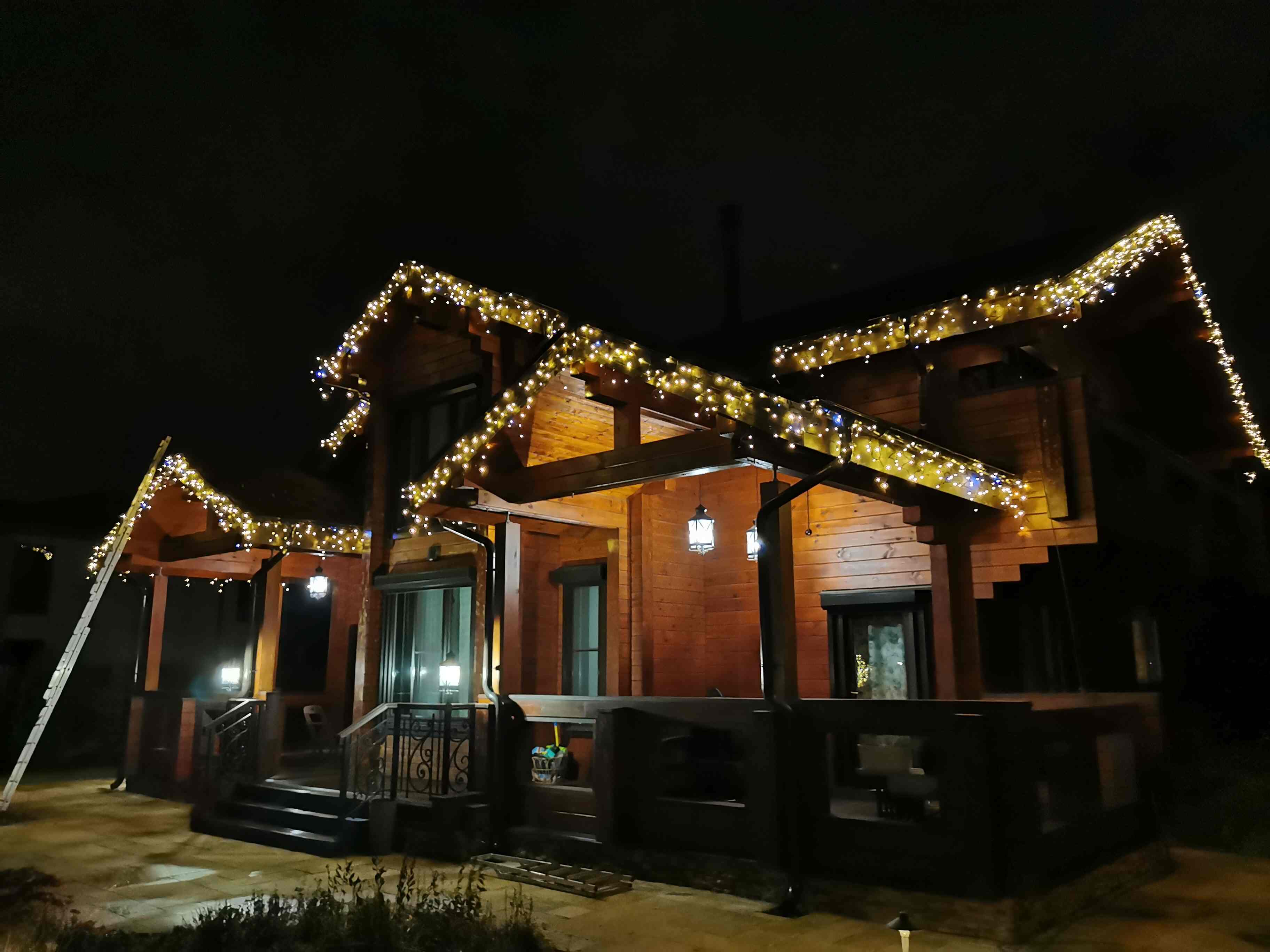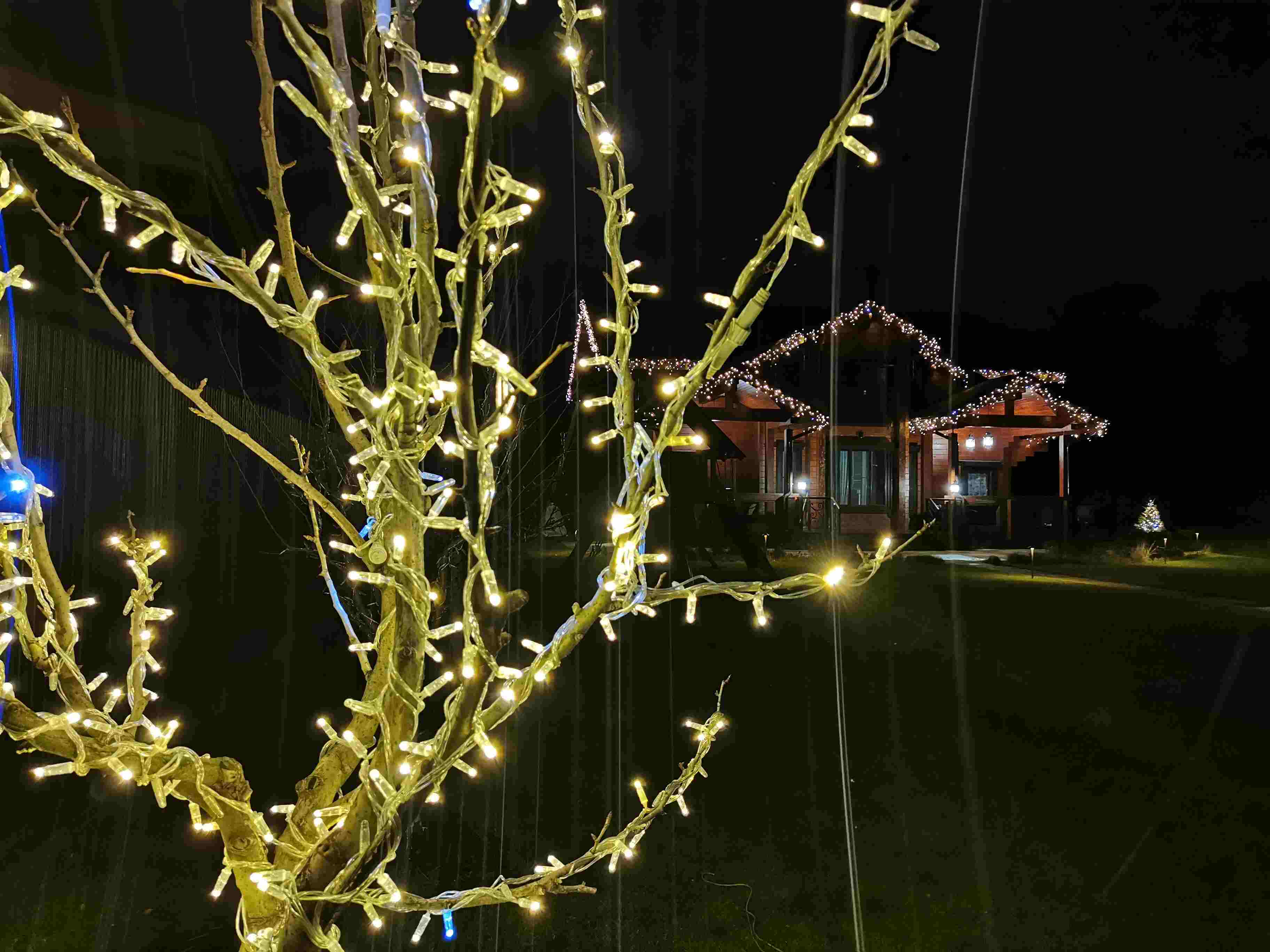 В Мартемьяново мы оформили частный дом и участок: на фасад установили бахрому, а ёлку и деревья украсили гирляндой-нитью. Всего за один день дом преобразился — свет добавил уюта, праздничного настроения и стал мягким освещением для территории.