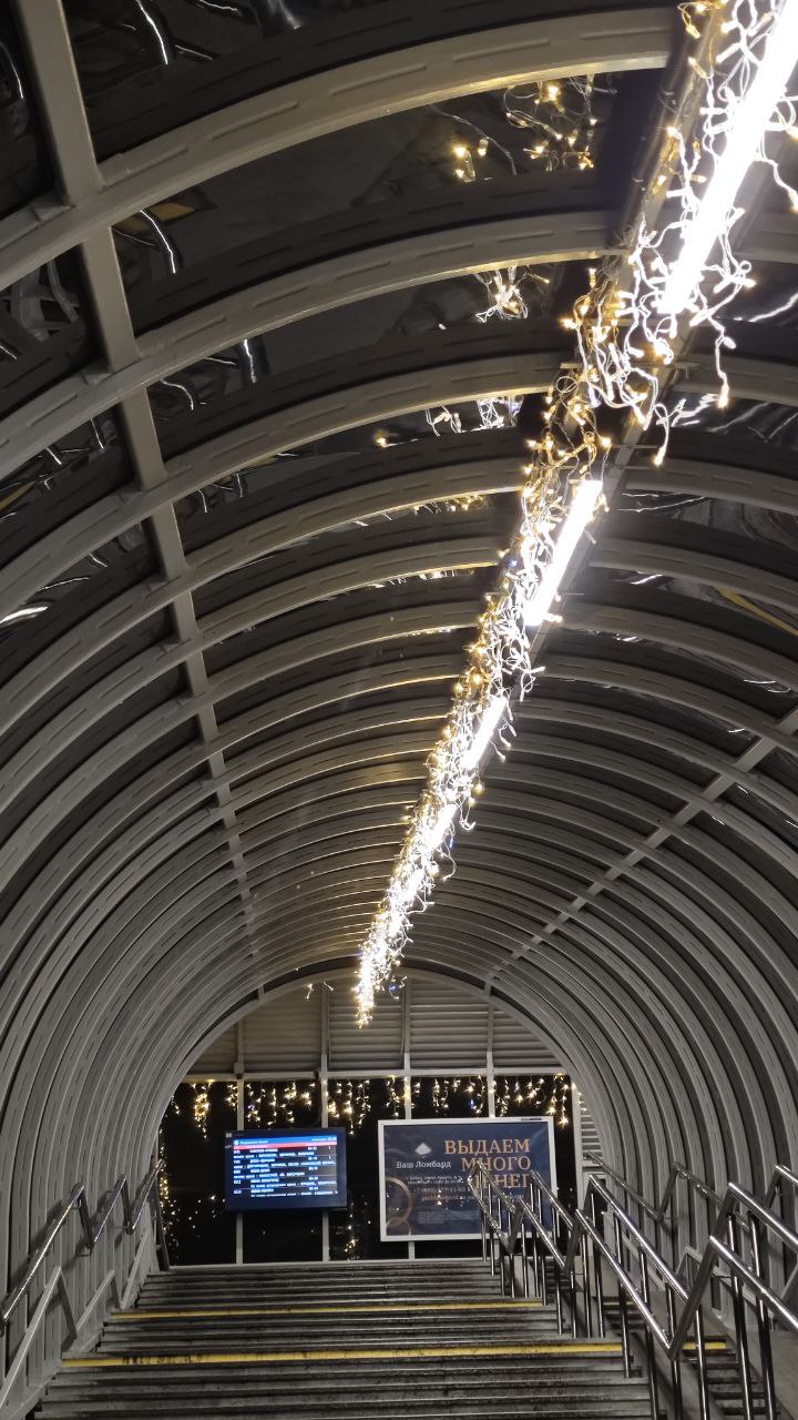 Для переходных арок пассажирской станции мы разработали и смонтировали комбинированное решение: снаружи архитектурный контур из гибкого неона, внутри — праздничная бахрома. Работы выполнялись в сжатые сроки и только в ночные окна, с соблюдением всех требований безопасности и согласований.