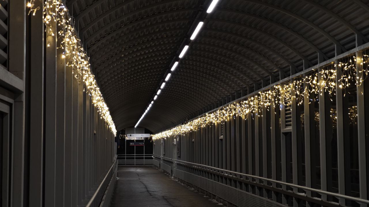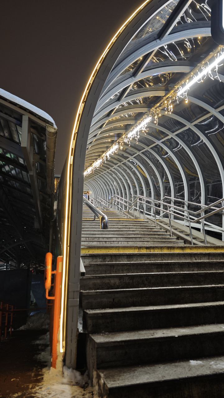 Подсветка действующей станции МЦД в Лобне стала проектом, куда нас пригласили по рекомендации. Объектом были переходные арки пассажирской станции, и от исполнителя требовалось аккуратно подчеркнуть архитектуру снаружи и создать праздничную атмосферу внутри переходов. Основными условиями стали работа в сжатые сроки, строгое ограничение по времени — всего пять часов в ночное окно с 23:00 до 05:00, а также обеспечение полной безопасности на действующем объекте с пассажиропотоком.