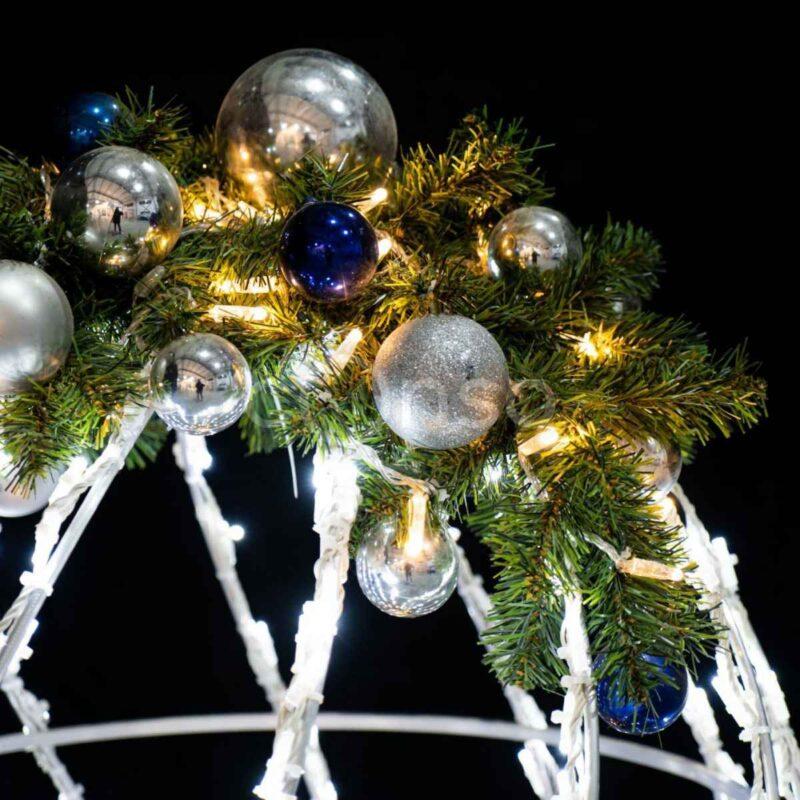 Перед монтажом была подготовлена визуализация в нескольких вариантах. Сначала показали оформление только с гирляндой «бахрома», затем добавили архитектурный неон. Клиент выбрал комбинированное решение — оно эффектнее подчёркивало архитектуру. Также были предложены тёплый и нейтральный оттенки свечения. Итоговое решение — тёплый белый свет.