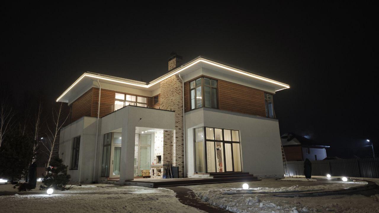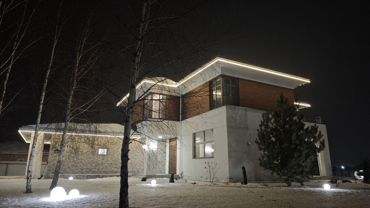 Подсветка делает дом в Раменском более выразительным и заметным, при этом сохраняя минимализм и строгость линий. Простое решение превратило фасад в аккуратный и эстетичный акцент в уличном пространстве.