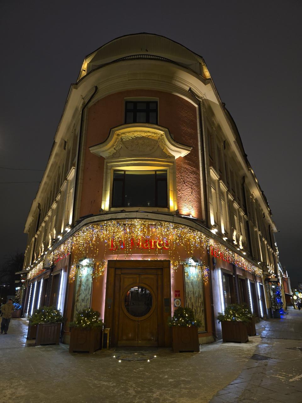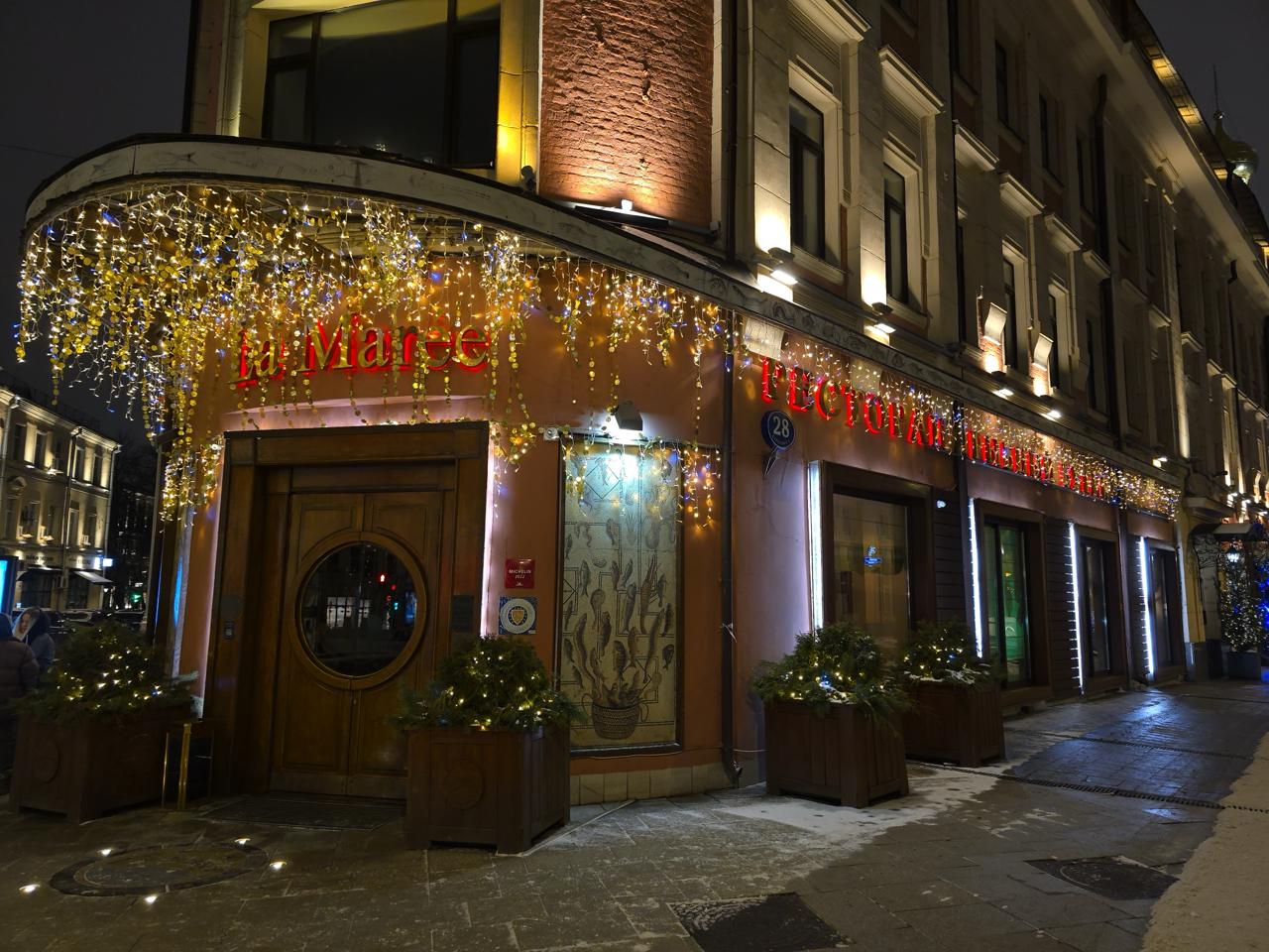 Фасад ресторана украшен гирляндой-бахромой тёплого белого света, которая плавно переходит вдоль всего здания. Эффект поддерживают архитектурные прожекторы и небольшие композиции с гирляндами-нитями на елях у входа. Вечером здание выглядит торжественно и ярко, оставаясь при этом элегантным и гармоничным.