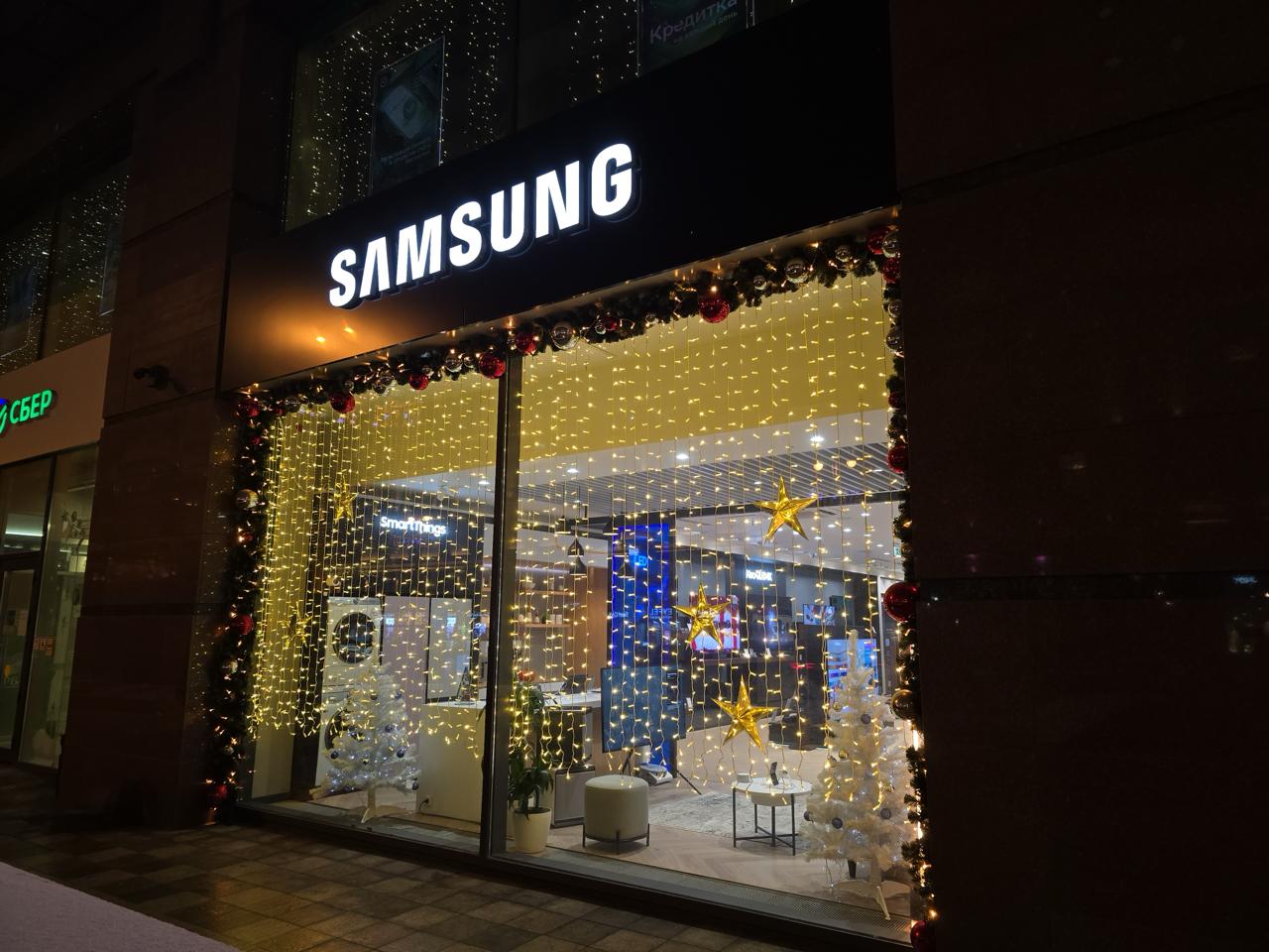 Витрины флагманского магазина Samsung украшены гирляндой-занавесом в тёплом белом свете. По периметру фасада оформлена хвойная композиция с крупными декоративными шарами и акцентной подсветкой. Свет мягко рассеивается по стеклу, подчёркивая чистые линии и технологичный стиль бренда.