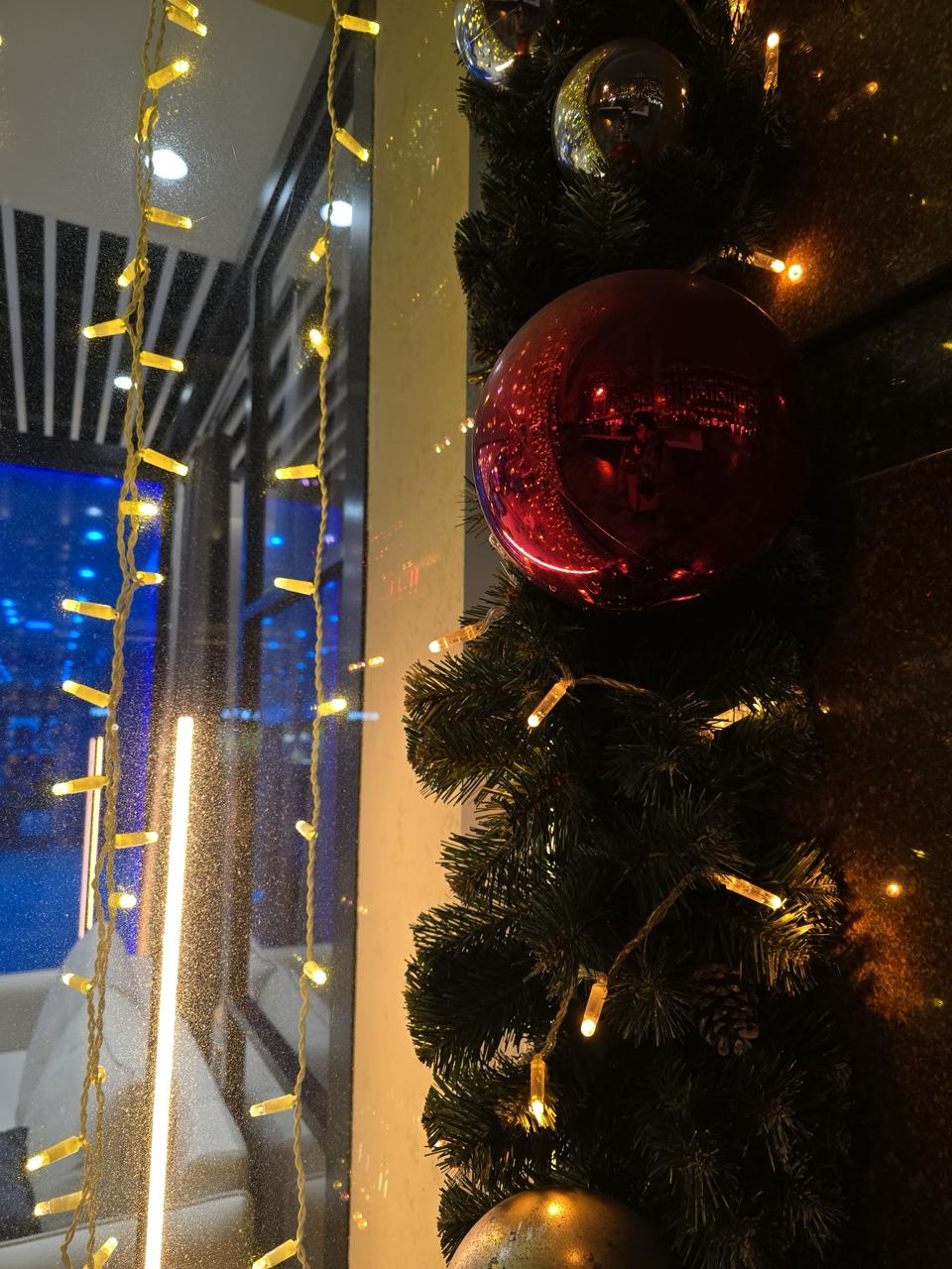 Основная идея — объединить фирменный минимализм бренда и атмосферу праздника. Тёплое свечение гирлянд смягчает строгую архитектуру фасада и делает пространство более уютным и гостеприимным.