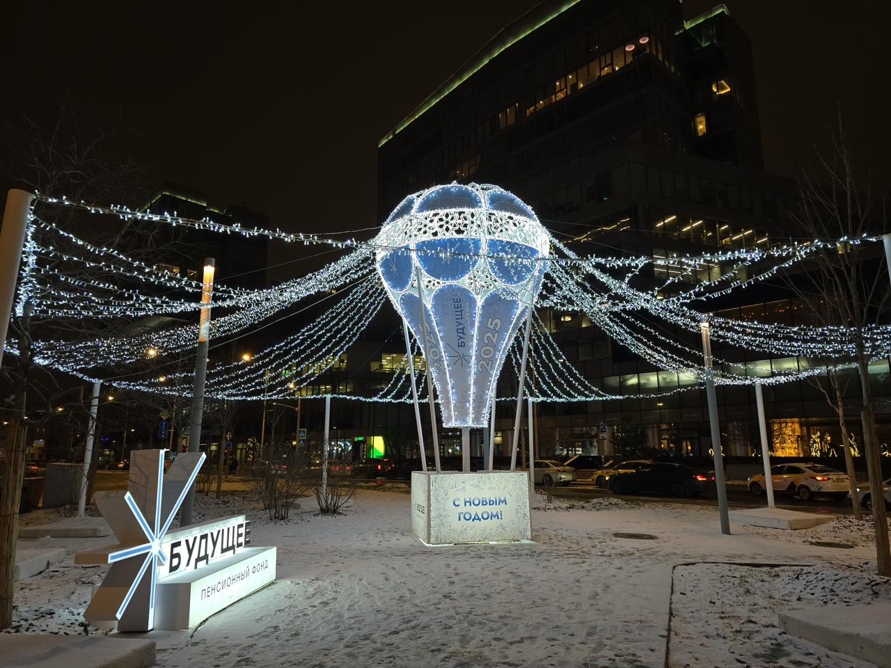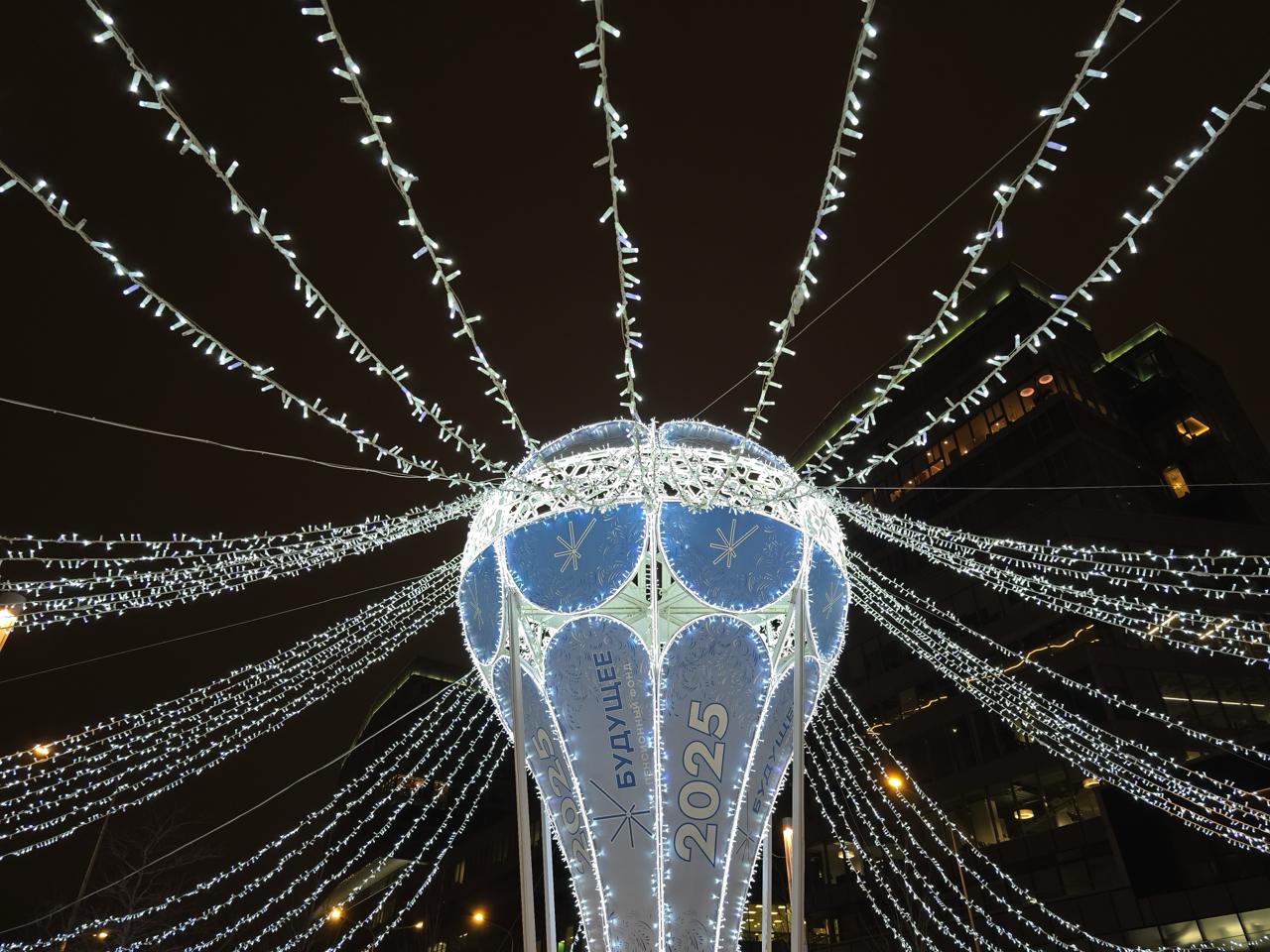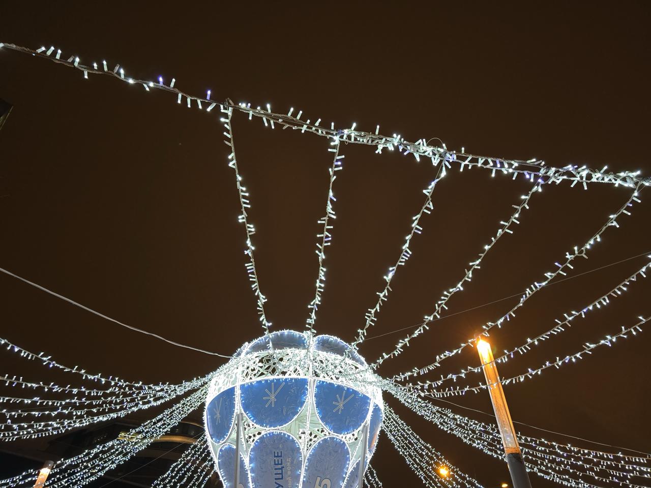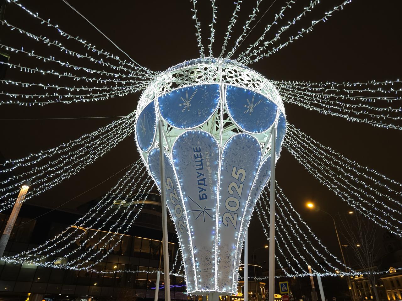 Праздничная световая композиция в виде большого воздушного шара с гирляндами, расходящимися от центра к опорам. Инсталляция установлена на открытой городской площадке и стала центральным элементом зимнего оформления зоны отдыха.