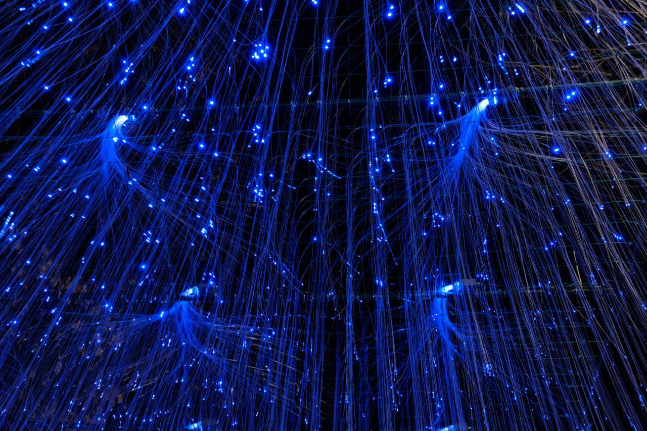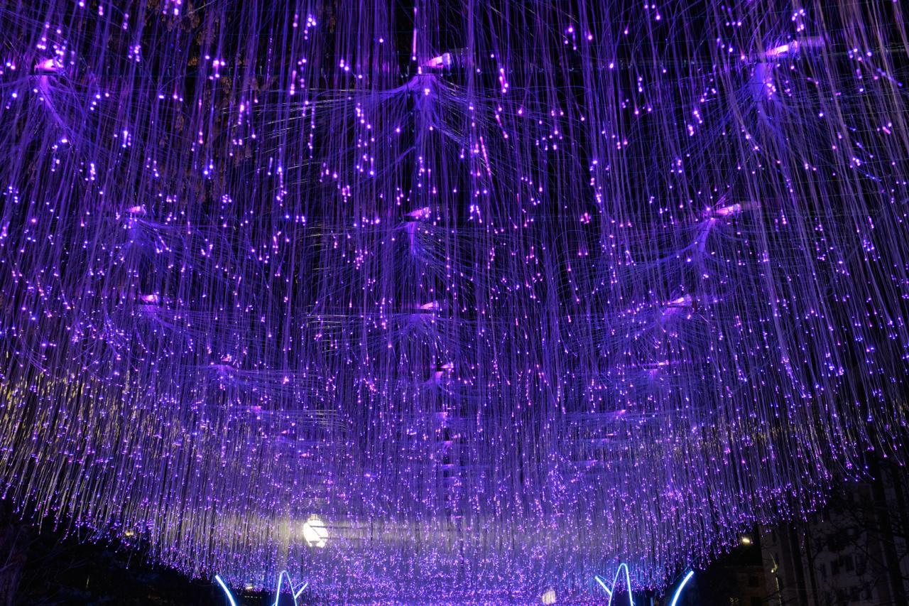 Главный акцент аллеи — световой тоннель, выполненный из светодиодных волокон. Тысячи тонких нитей образуют сияющий потолок, который переливается и меняет оттенки, создавая эффект звёздного неба. Благодаря динамическим сценариям подсветки пространство выглядит живым и постоянно меняющимся.