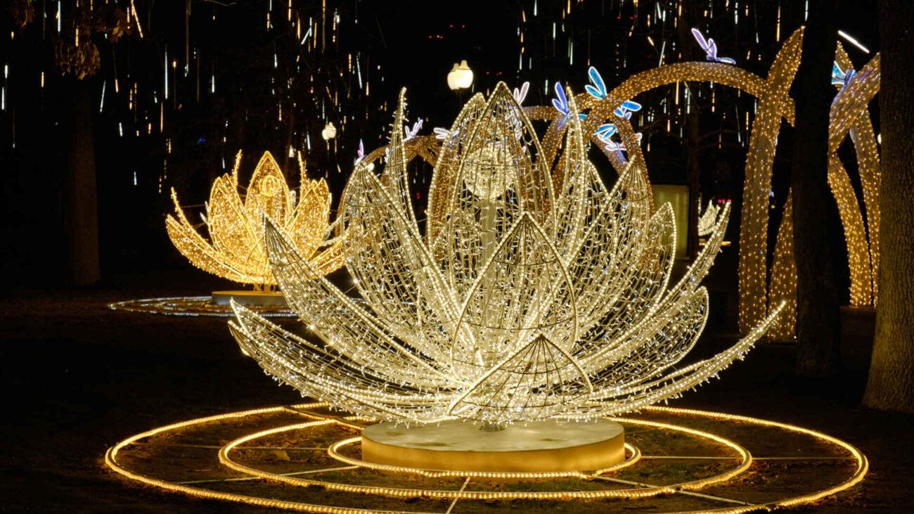 По обе стороны дорожки расположены декоративные световые фигуры — стилизованные формы в виде раскрытых бутонов и арт-объектов. Они работают в единой программе с тоннелем: цвета и режимы свечения синхронизированы, что создаёт ощущение целостной композиции.