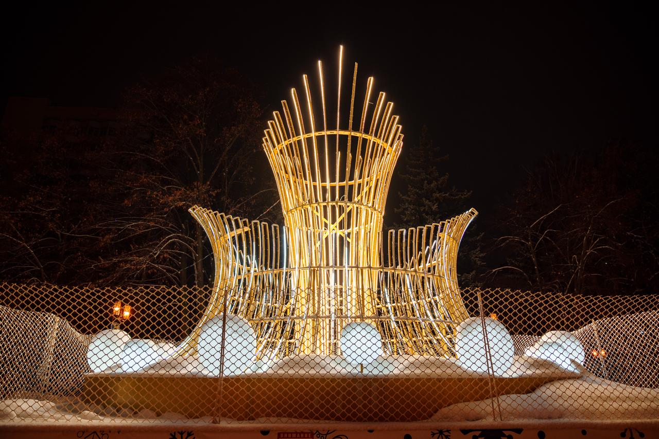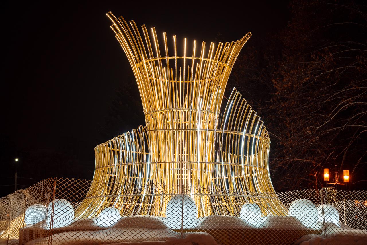 В тёмное время суток композиция становится центральным элементом пространства — тёплое свечение выделяется на фоне снега и подчёркивает пластичность конструкции. Световые шары вокруг усиливают эффект лёгкости и глубины.