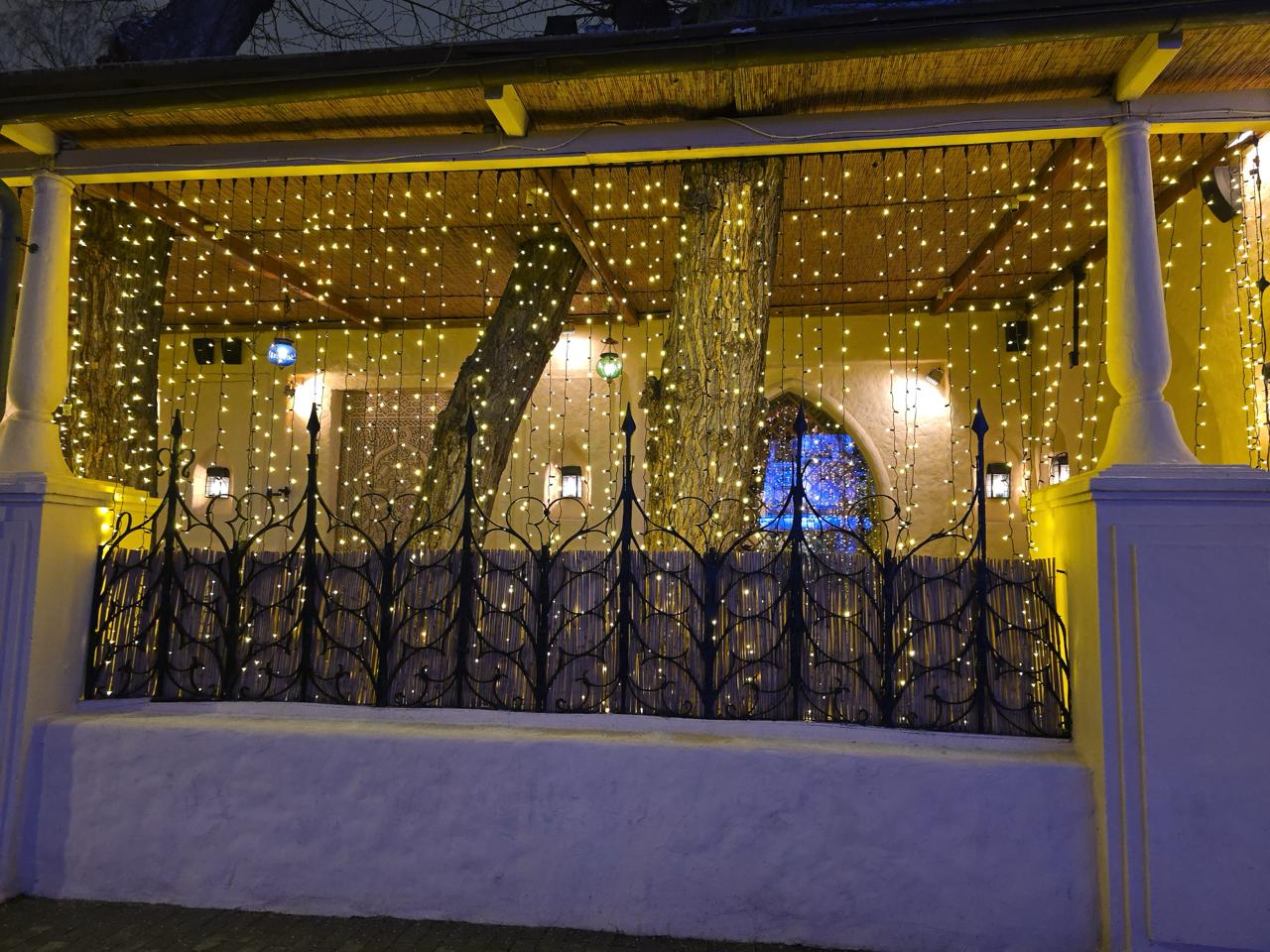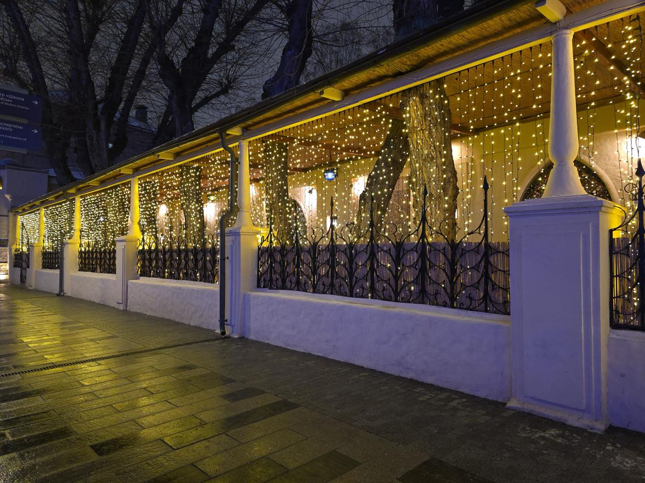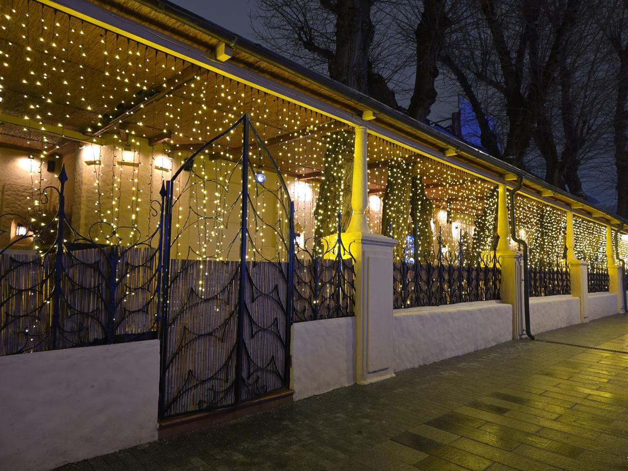 Фасад и терраса украшены гирляндами занавес тёплого белого свечения. Свет мягко заливает пространство, подчёркивает детали архитектуры и создаёт уютную атмосферу для гостей. В зоне входа установлены прожекторы, акцентирующие главный портал и декоративные элементы фасада.