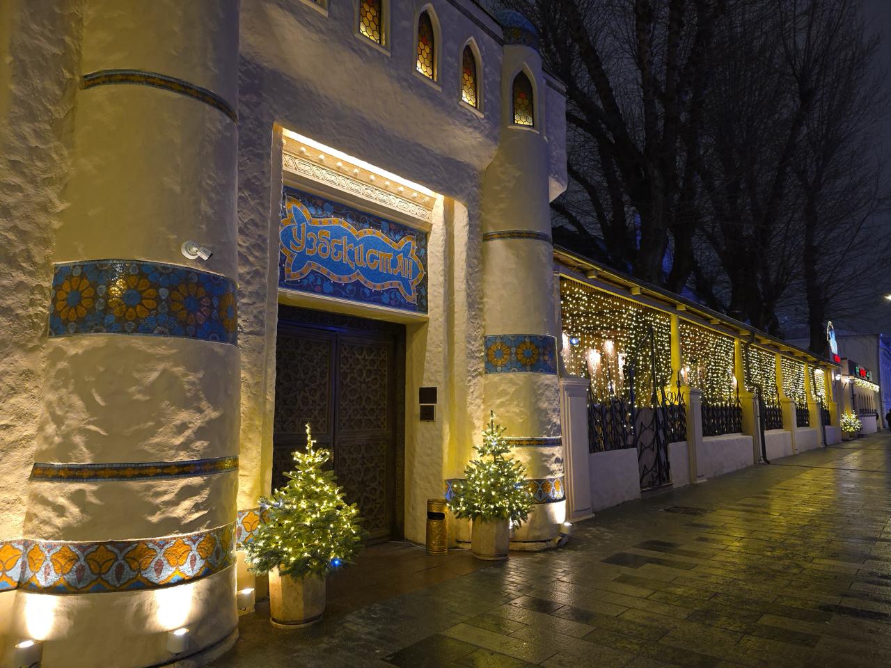 Вечером фасад выглядит особенно выразительно: гирлянды создают ощущение лёгкости и тепла, а мягкий свет подчёркивает архитектуру и выделяет ресторан среди окружающих зданий. Входная зона стала центральным световым акцентом, притягивающим внимание гостей и прохожих.
