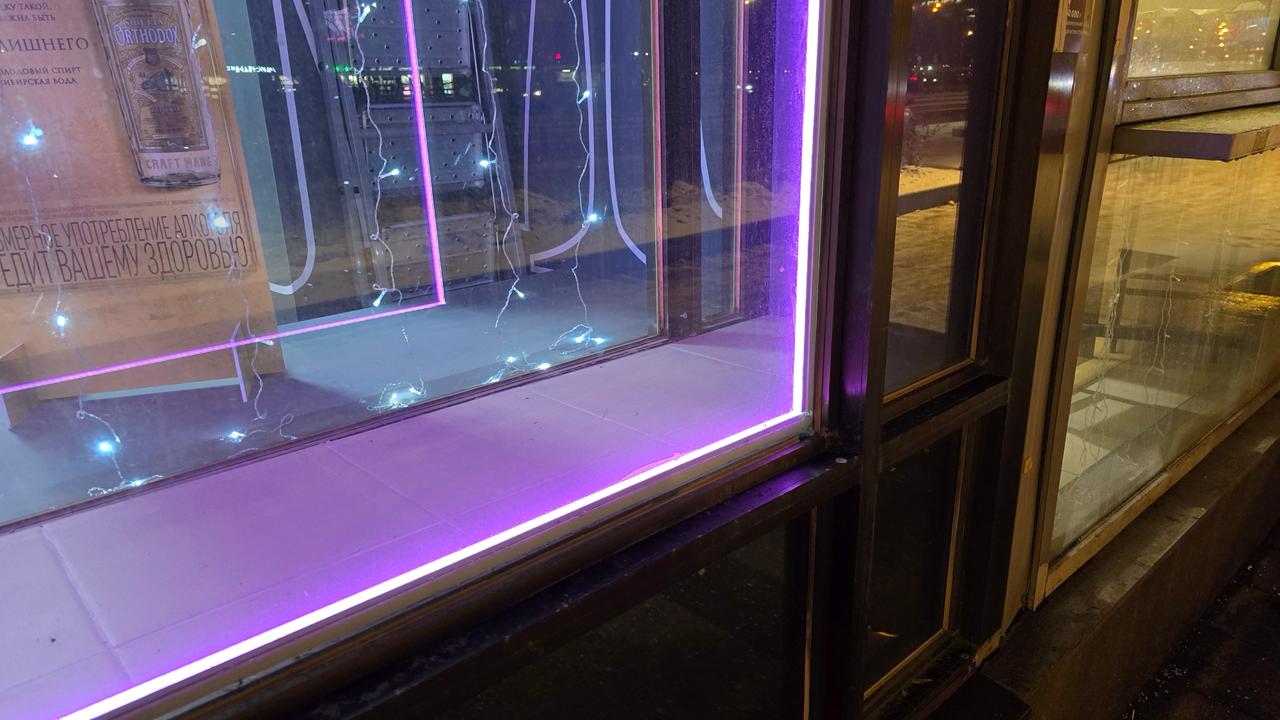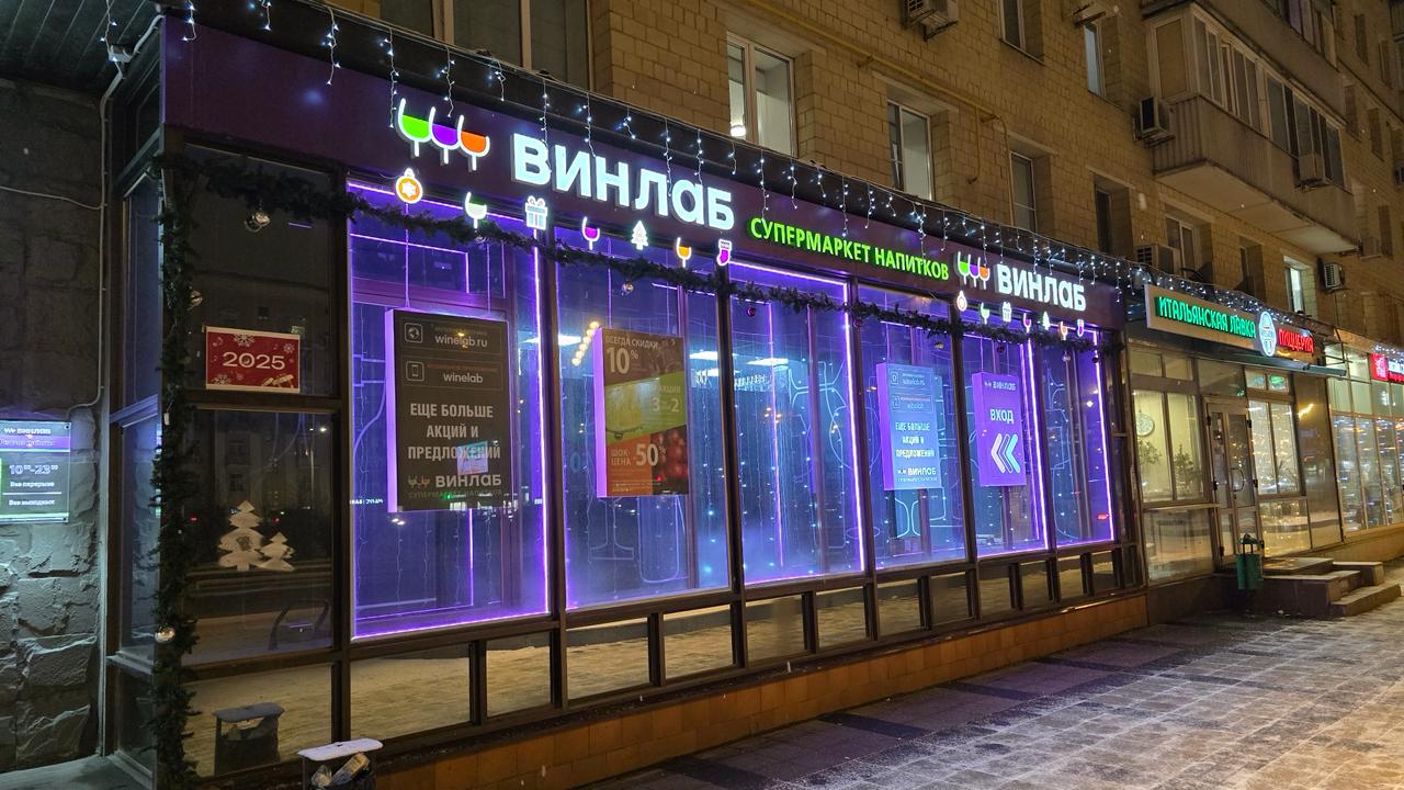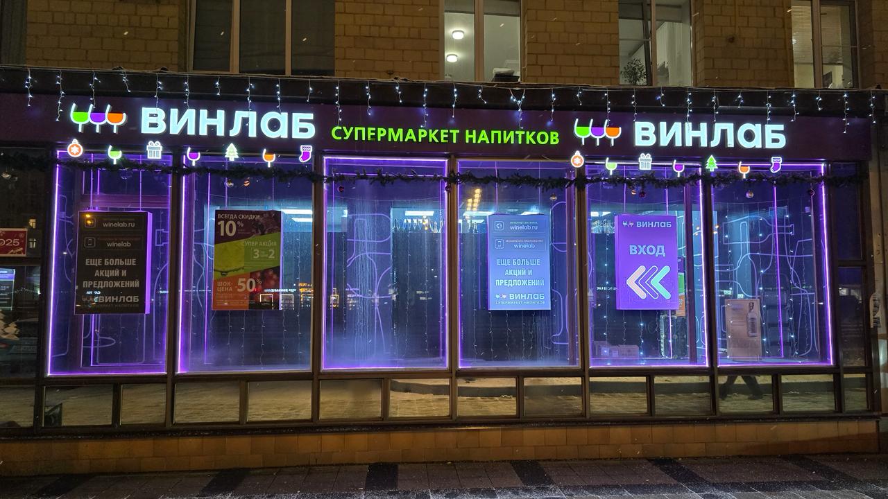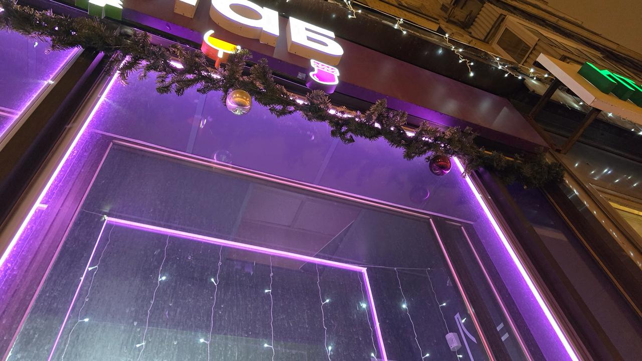 Вечером фасад магазина заметен издалека: фиолетовый контур мгновенно ассоциируется с брендом, а холодное свечение гирлянд создаёт атмосферу чистоты и стиля. Такое сочетание подчёркивает современный образ сети и привлекает внимание прохожих.