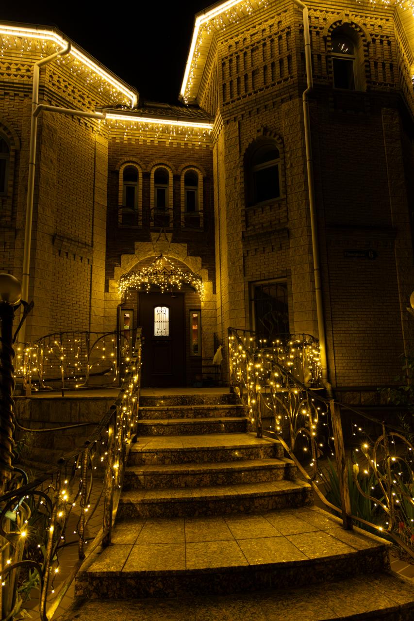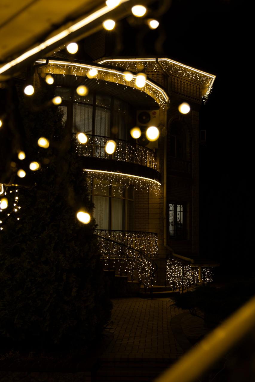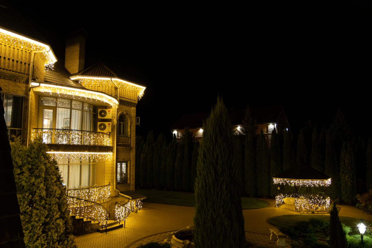— гирлянда-бахрома размещена под свесами, создавая мягкое свечение и добавляя праздничное настроение.