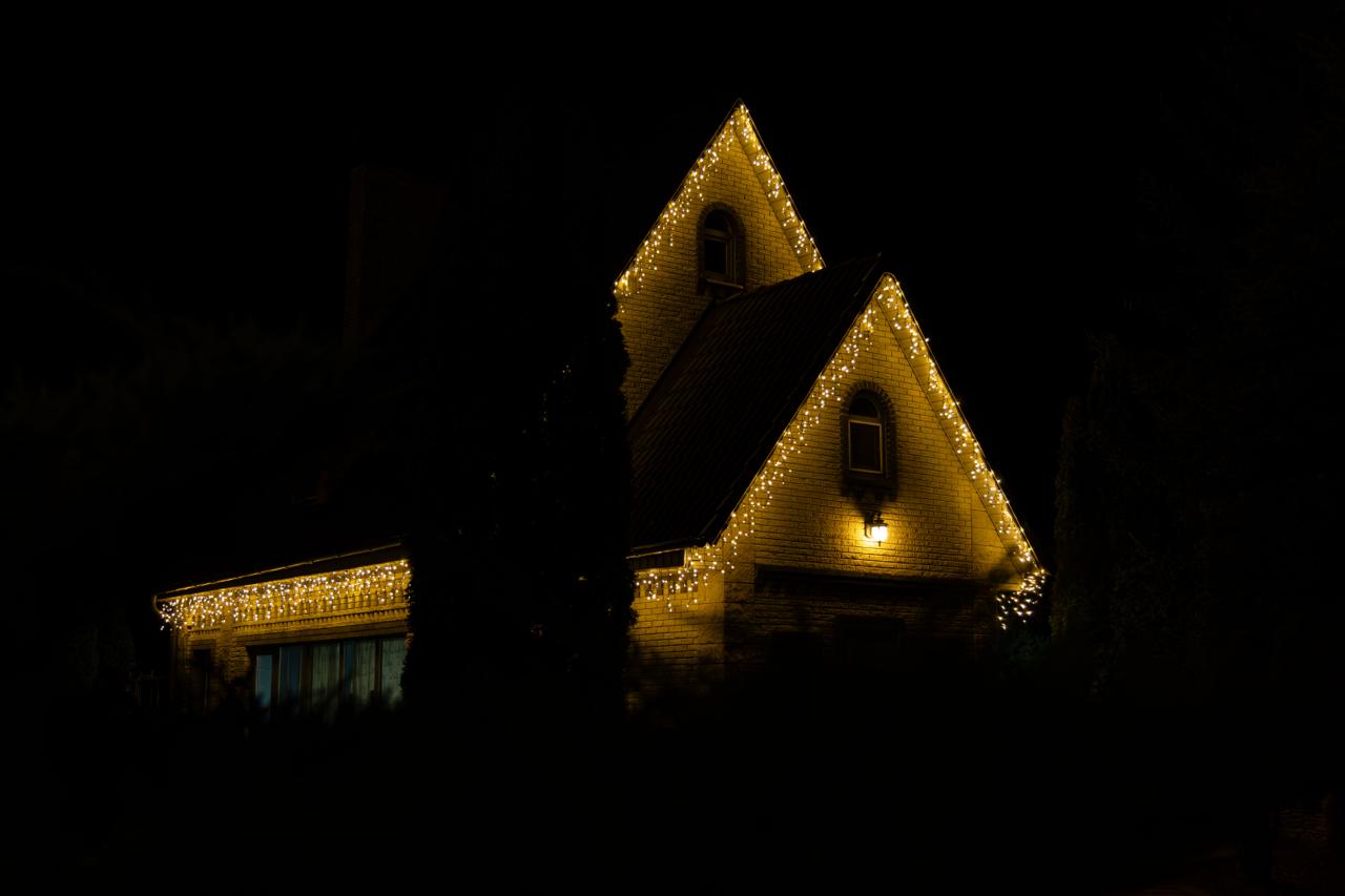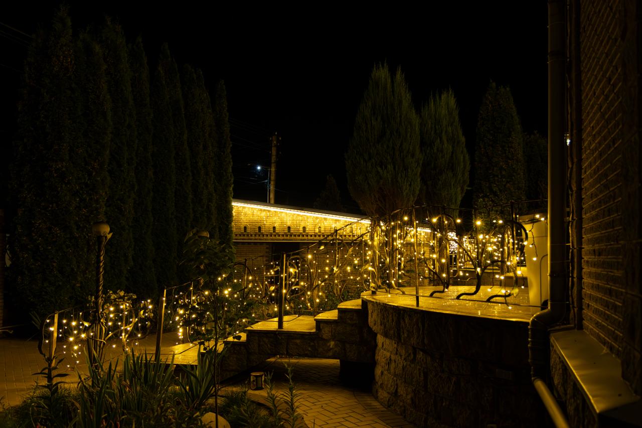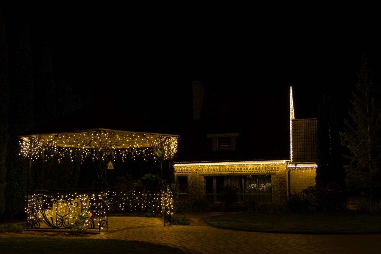 — гирлянда-бахрома размещена под свесами, создавая мягкое свечение и добавляя праздничное настроение.