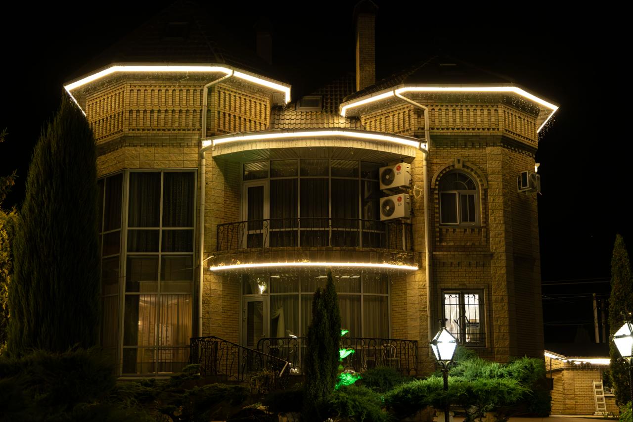 Сочетание неона и бахромы позволило объединить все строения на участке в единую композицию. Тёплое свечение не ослепляет, выглядит аккуратно и гармонично. Вечером дом и прилегающая территория приобретают выразительный, но сдержанный вид — современный, уютный и праздничный одновременно.
