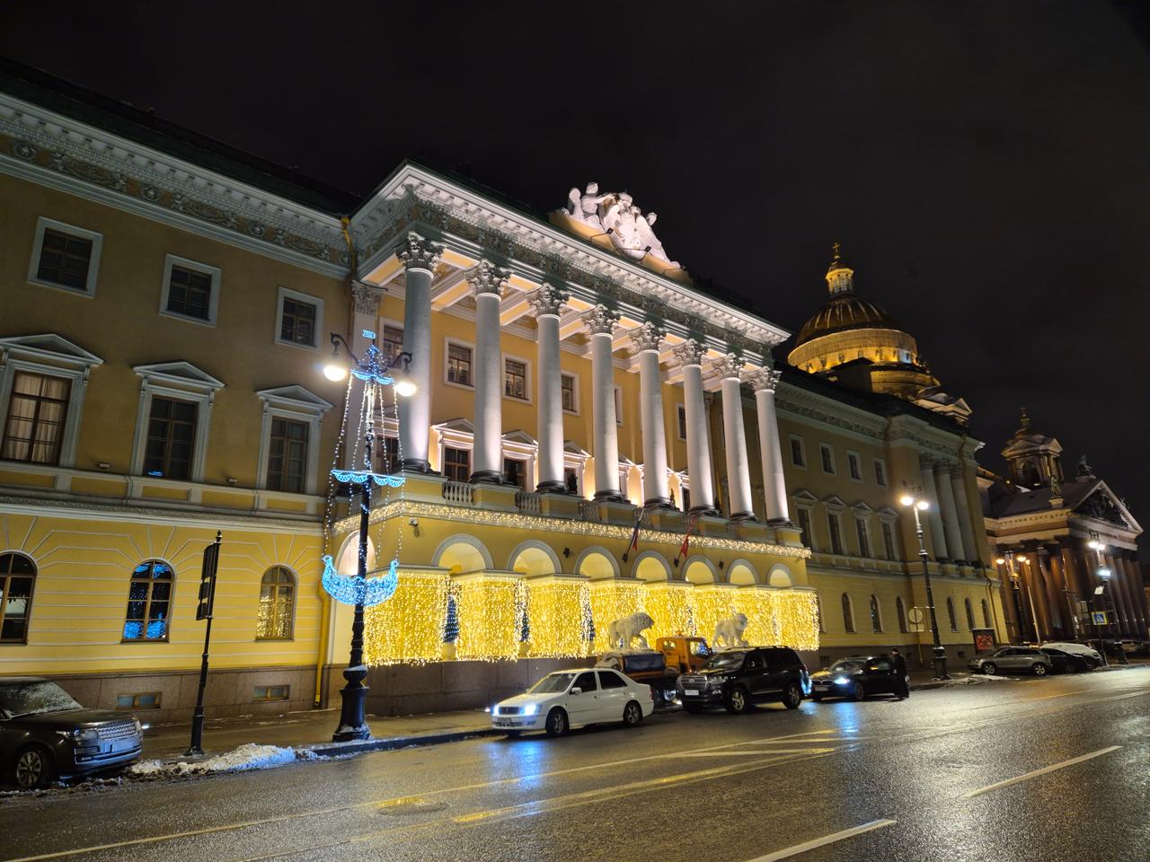 Фасад муниципального здания украшен бахромой тёплого оттенка разной длины, которая подчеркнула величественную архитектуру колонн и карнизов. Дополнительный акцент создала консоль в виде корабля с мачтой голубого цвета, а между колоннами установлены искусственные ёлки, декорированные гирляндой-нитью в холодном голубом свечении. Такое сочетание сделало здание праздничным и выразительным, сохранив при этом элегантность и торжественность.