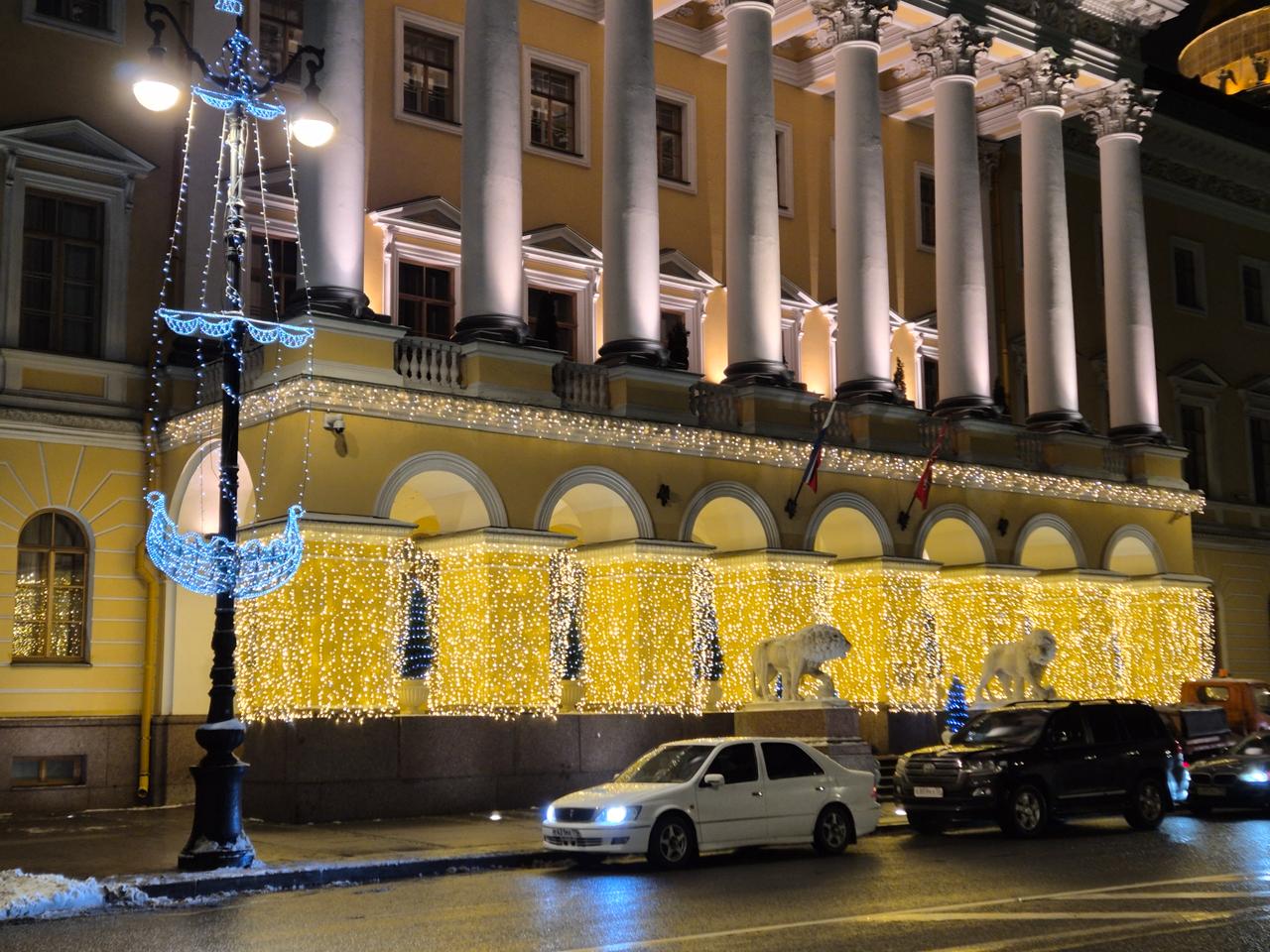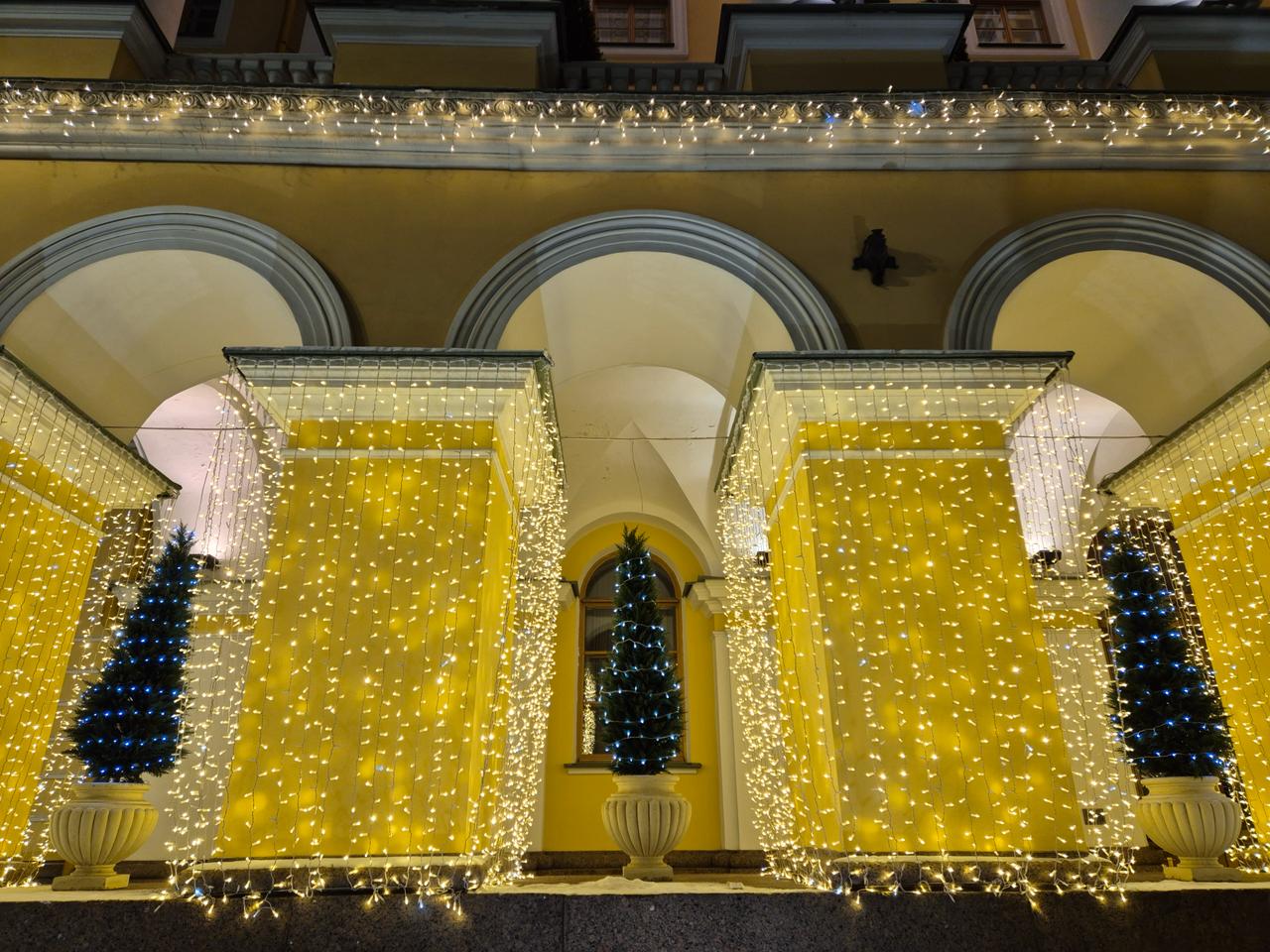Между колоннами здания установлены искусственные ели, украшенные гирляндами-нитями холодного голубого свечения. Их линии гармонично соединились с архитектурой фасада, а световые акценты добавили глубину и завершённость общей композиции.
