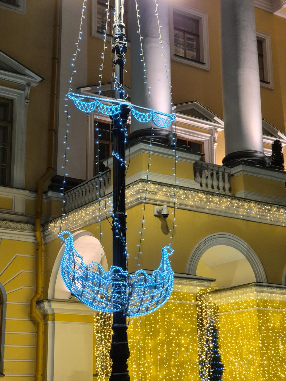 Особое внимание привлекла консоль в виде корабля с мачтой голубого цвета, закреплённая на уличной опоре. Этот элемент стал символическим акцентом, отражающим морскую тематику Петербурга и сразу притягивающим взгляды прохожих.