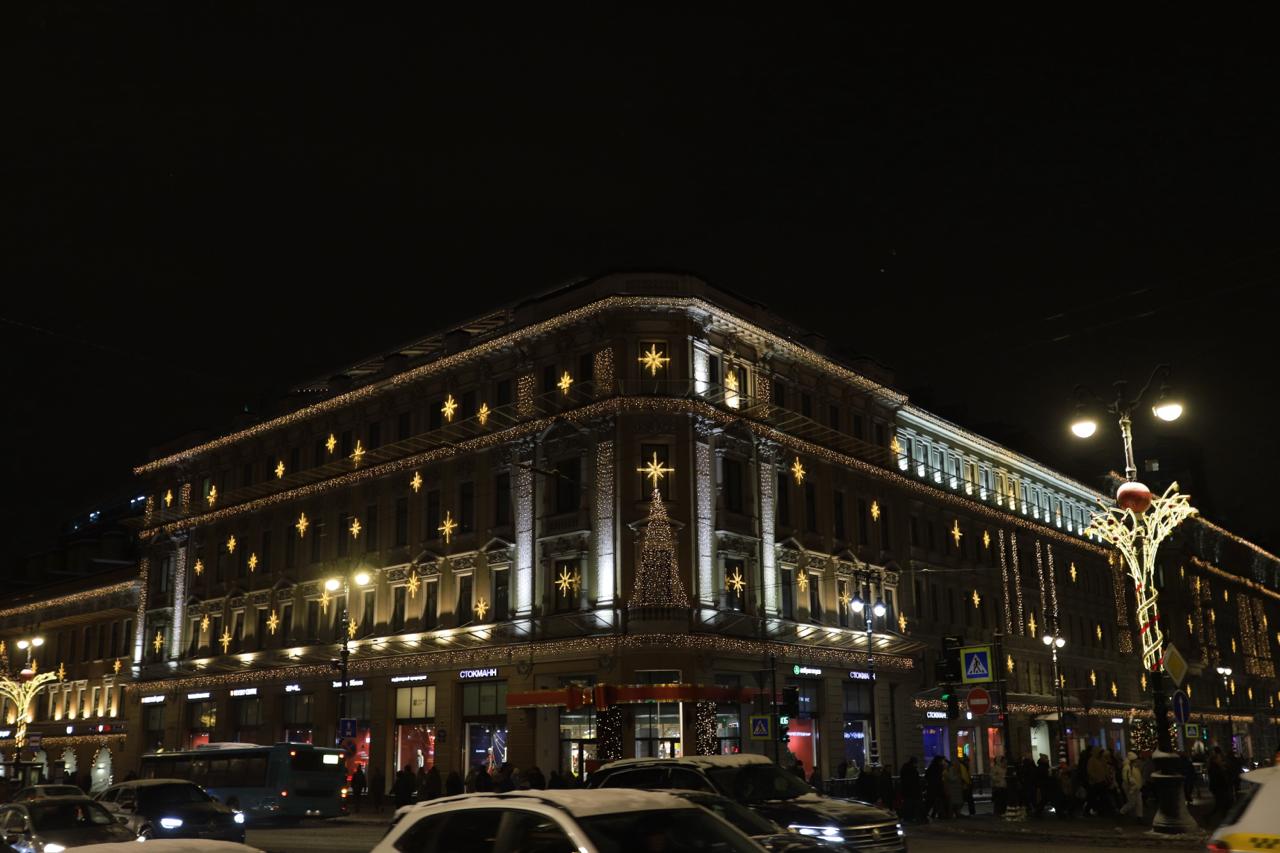 Главная идея — объединить архитектурную строгость и праздничную атмосферу света. Холодное белое свечение придаёт фасаду торжественность, а тёплые акценты звёзд, бахромы и елового декора добавляют уюта и мягкости.
