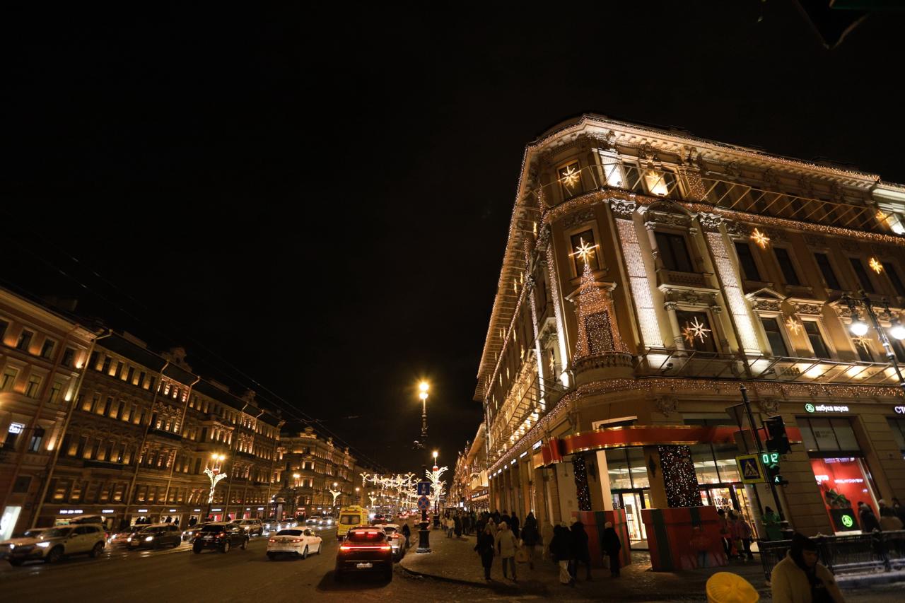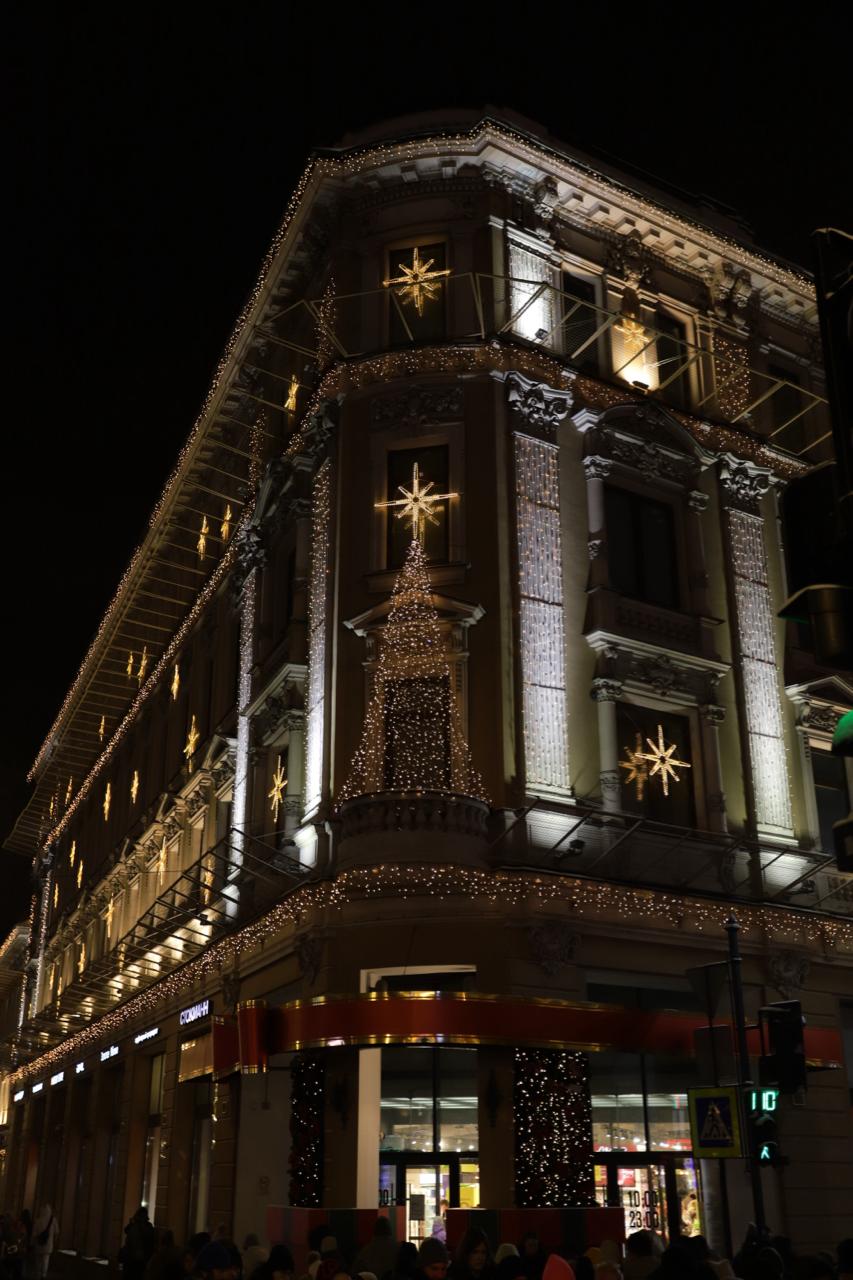 Фасад исторического здания оформлен с использованием световых фигур звёзд, гирлянд-сетей, образующих ёлку, гирлянды занавес, которая подчёркивает вертикальные линии и выделяет подобие колонн на фасаде, а также гирлянды бахромы, задающей горизонтальный ритм и подчеркивающей линии кровли. В зоне входной группы размещена еловая композиция с гирляндой нить, а архитектурные элементы дополнительно выделены прожекторной подсветкой.