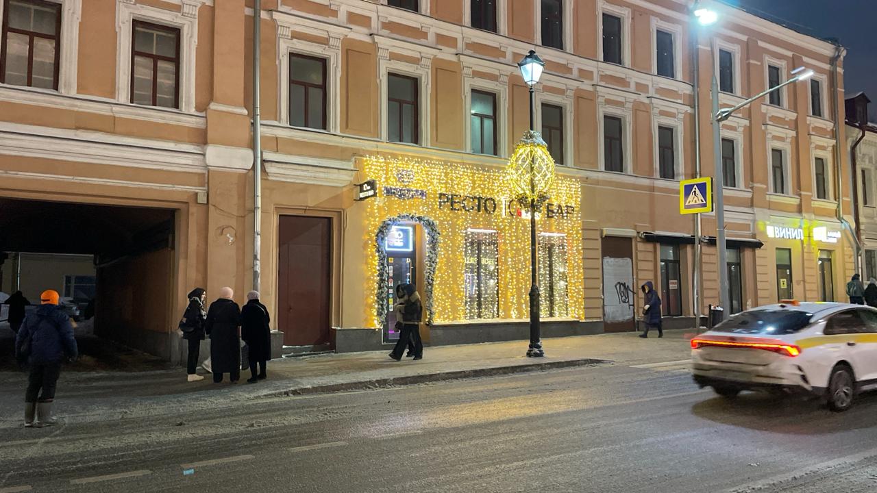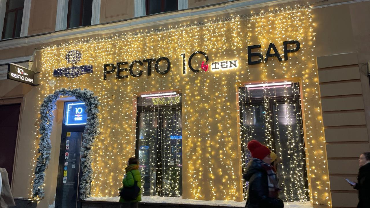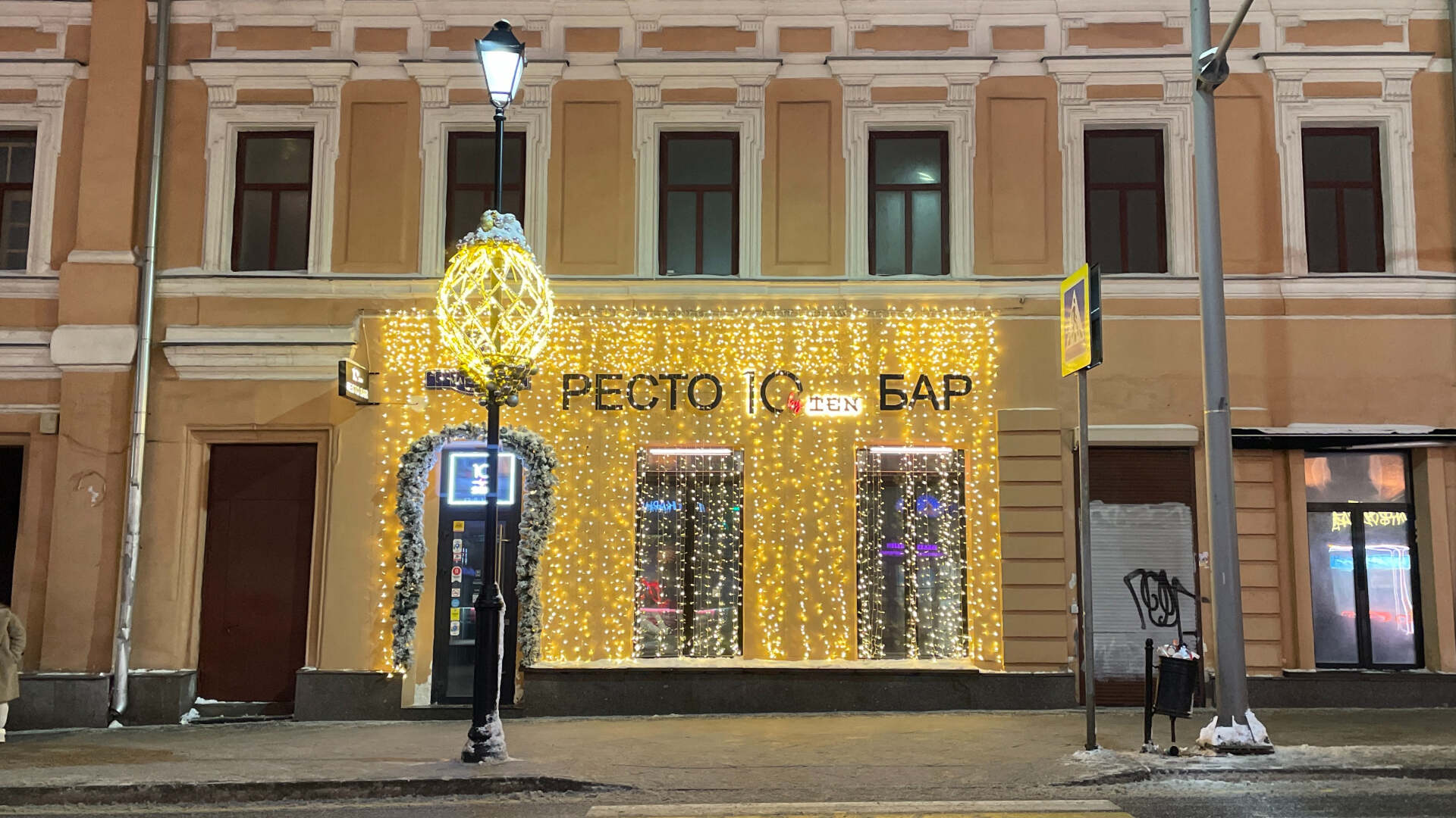 Фасад ресторана оформлен гирляндой-занавесом тёплого белого свечения. Плотное свечение создаёт эффект мягкой световой стены, подчёркивает архитектуру здания и задаёт праздничное настроение улице.