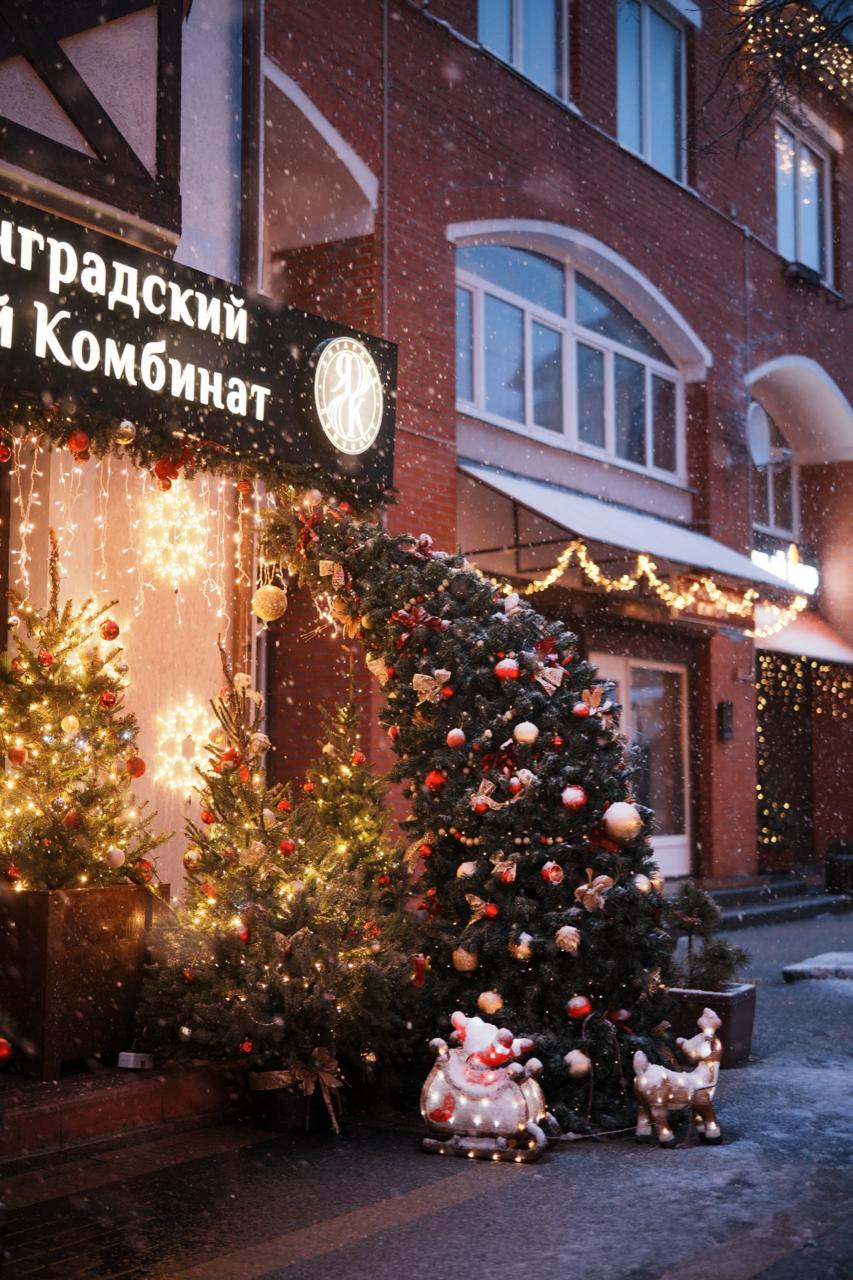 Магазин янтарного комбината к зимнему сезону оформлен в праздничной концепции: установлены живые и искусственная ели с гирляндами тёплого оттенка, добавлены световые фигуры-снежинки, а витрина украшена бахромой. Такое решение создало атмосферу тепла и уюта, привлекло внимание туристов и сделало магазин яркой точкой в городской среде.