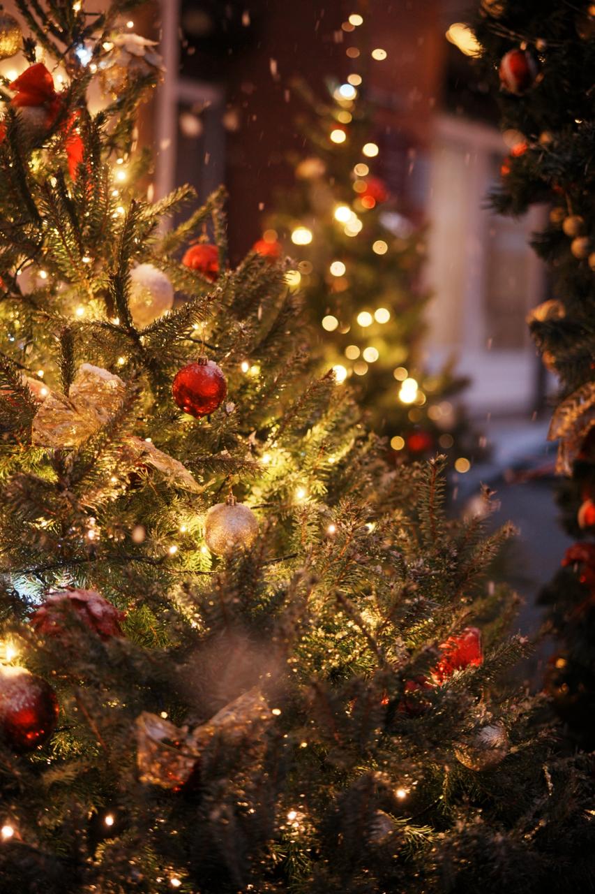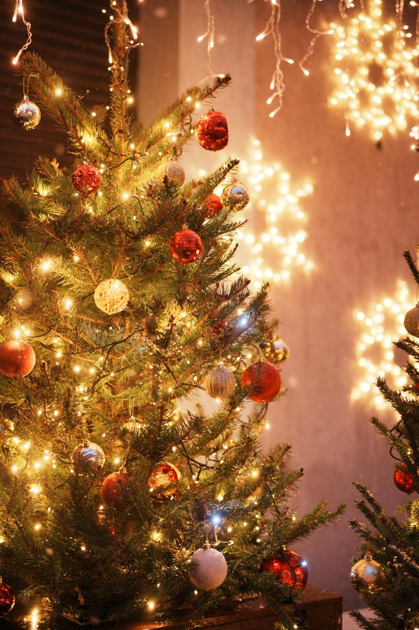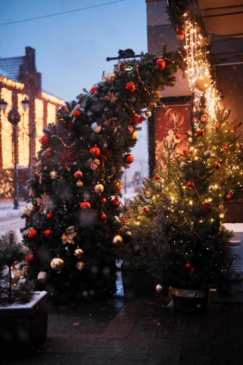 Основой композиции стали живая и искусственные ели, установленные у входа. Они украшены гирляндами-нитью тёплого белого свечения, которое создаёт ощущение уюта и домашнего тепла. Тёплый свет подчеркивает зелёную фактуру хвои и формирует атмосферу, располагающую к неспешным прогулкам и покупкам.