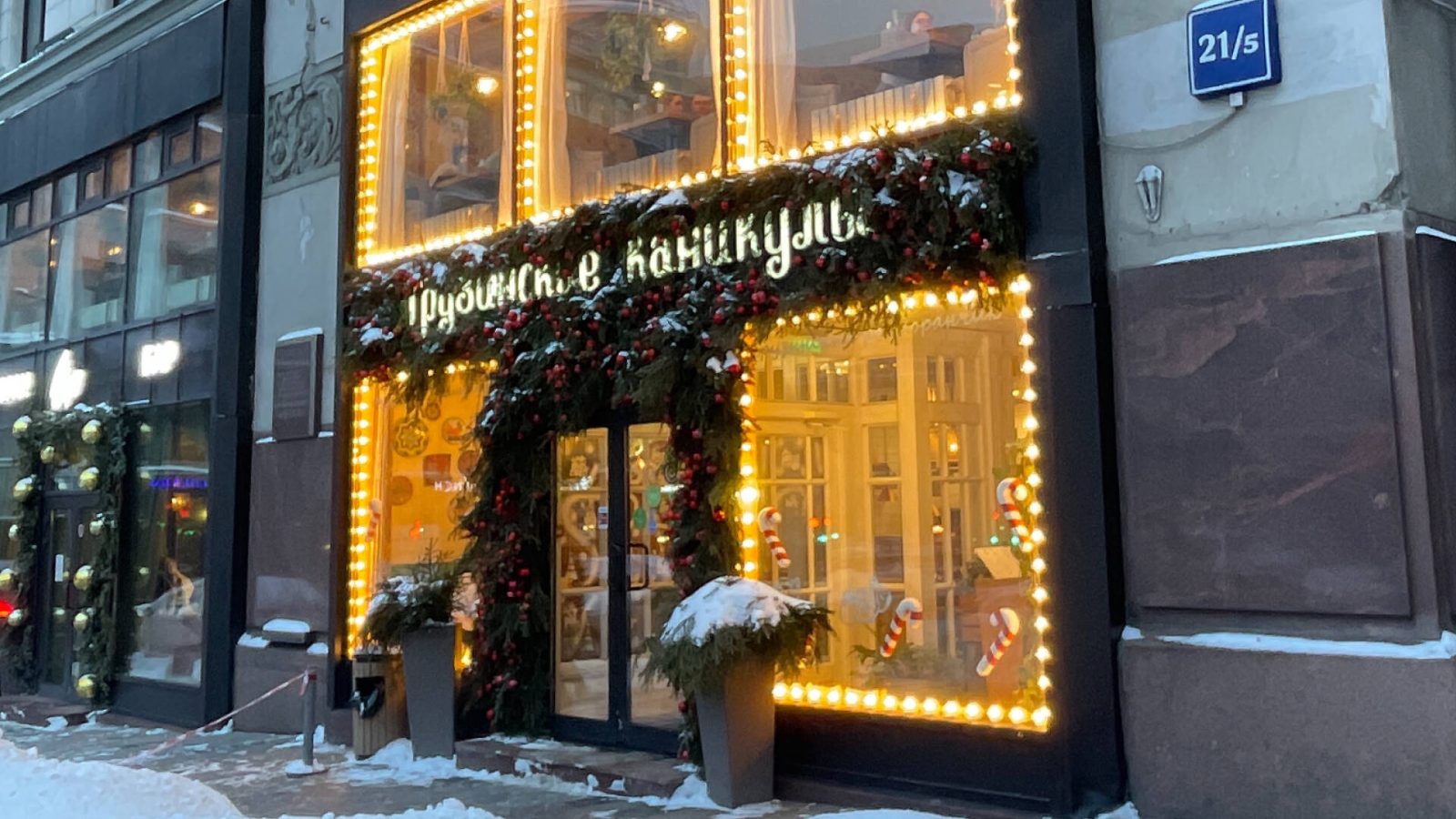Входная группа ресторана оформлена объёмной хвойной аркой с гирляндой тёплого белого света. В композиции использованы еловые ветви, красные ягоды и мягкое свечение гирлянд. Такое оформление создаёт ощущение тепла и праздника, подчёркивает стиль фасада и приглашает гостей внутрь.