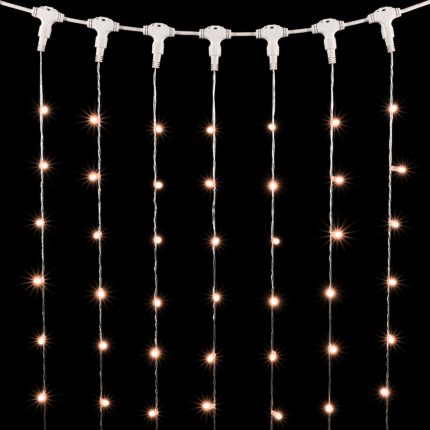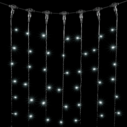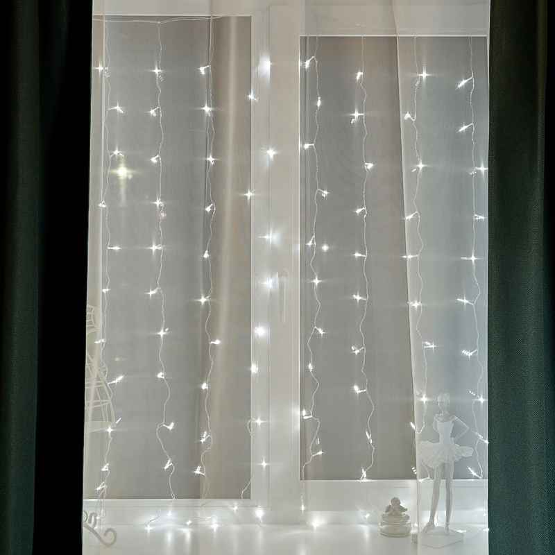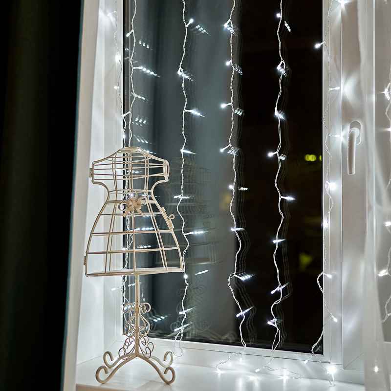Модель выполнена в формате занавеса: прозрачный ПВХ-провод длиной и высотой по 1.5 м формирует 12 вертикальных нитей, на которых равномерно размещены 144 ярких светодиода. Такое распределение создаёт эффект ровного светового полотна. Благодаря прозрачному проводу гирлянда остаётся практически незаметной днём, а вечером загорается и полностью преображает интерьер.