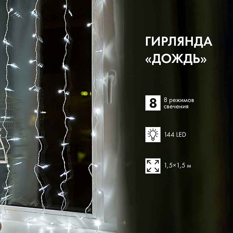 Гирлянда Занавес 1.5х1.5 м Белый с Динамикой, 144 LED, 230В, Прозрачный ПВХ, IP20