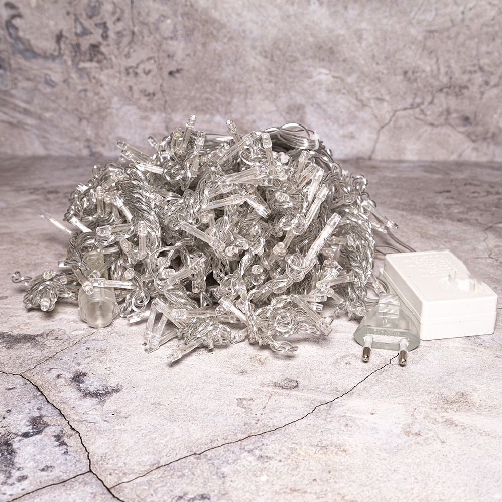 Прозрачный ПВХ-провод толщиной 1.8 мм выглядит аккуратно и не отвлекает внимание от света. Он гибкий, не ломается при монтаже, а после праздника гирлянду можно аккуратно свернуть и хранить до следующего года.
