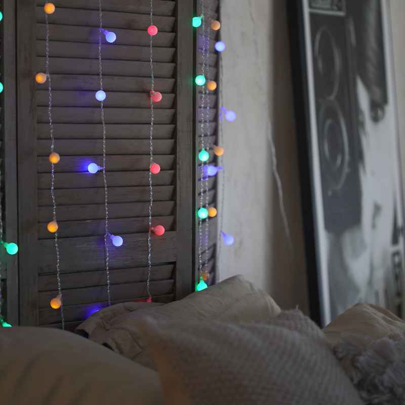 Разноцветные огни создают калейдоскоп света, который наполняет помещение атмосферой веселья и энергии. Благодаря насадкам-шарикам свечение становится мягким и равномерным, а гирлянда выглядит декоративно даже днём.
