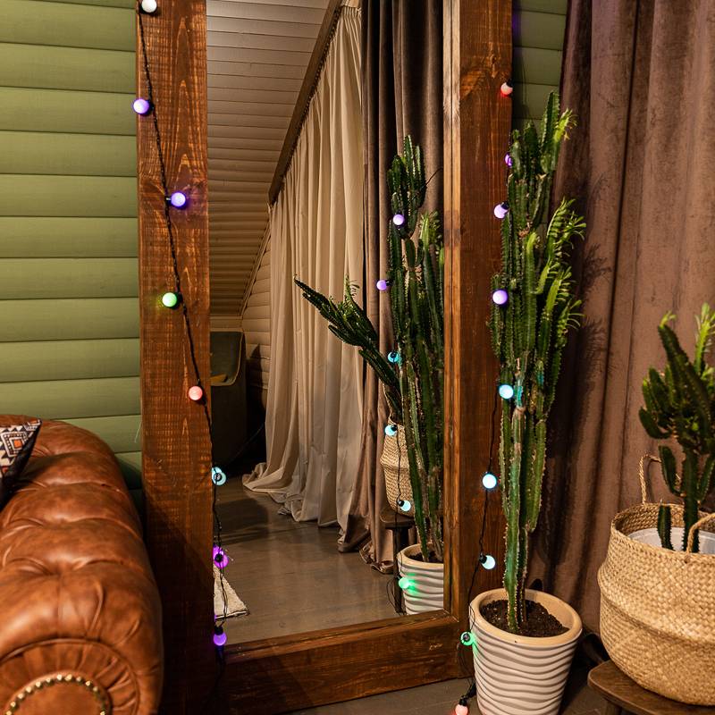 Шарики здесь — не крошечные точечки, как в классической нити, а крупные декоративные элементы по 30 мм каждый. Они заметны даже днём и дают мягкое рассеянное свечение. Цвета яркие, насыщенные, RGB-спектр переливается в реальном времени. Такой формат любят дети — свет кажется “живым”.