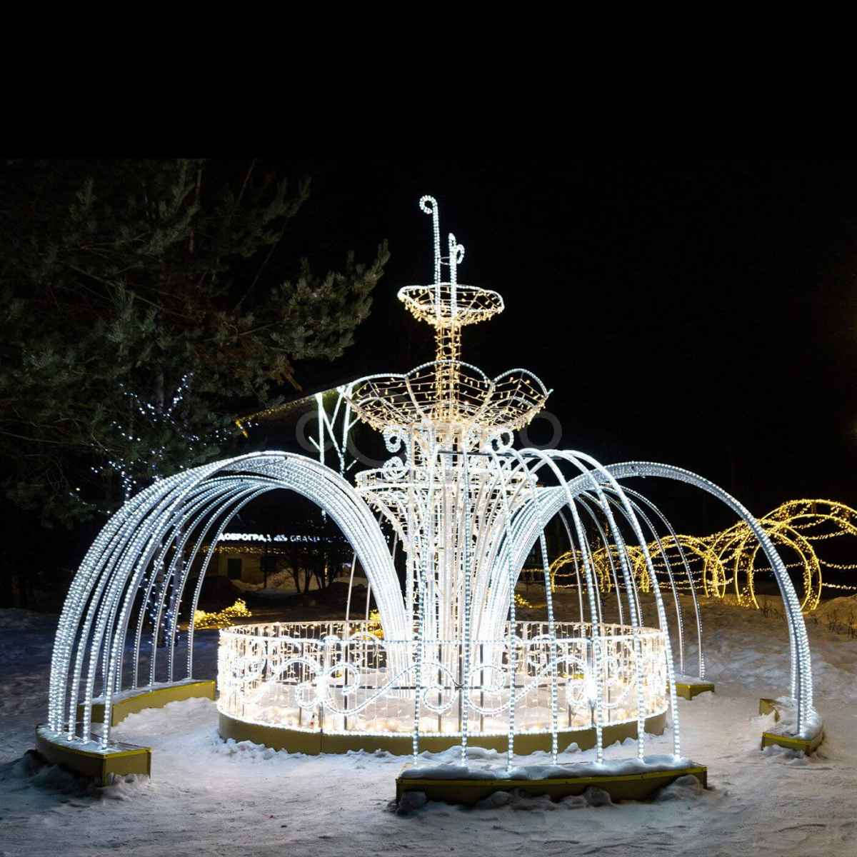 Новогодний световой фонтан — эффектная объёмная фигура для улицы. Размер 6×4,5×6 м, алюминиевый каркас, IP65, мерцающее золотое свечение. Украшает ТЦ, городские площади, входные группы. Безопасная эксплуатация круглый год. Производство и монтаж от JOYLED.