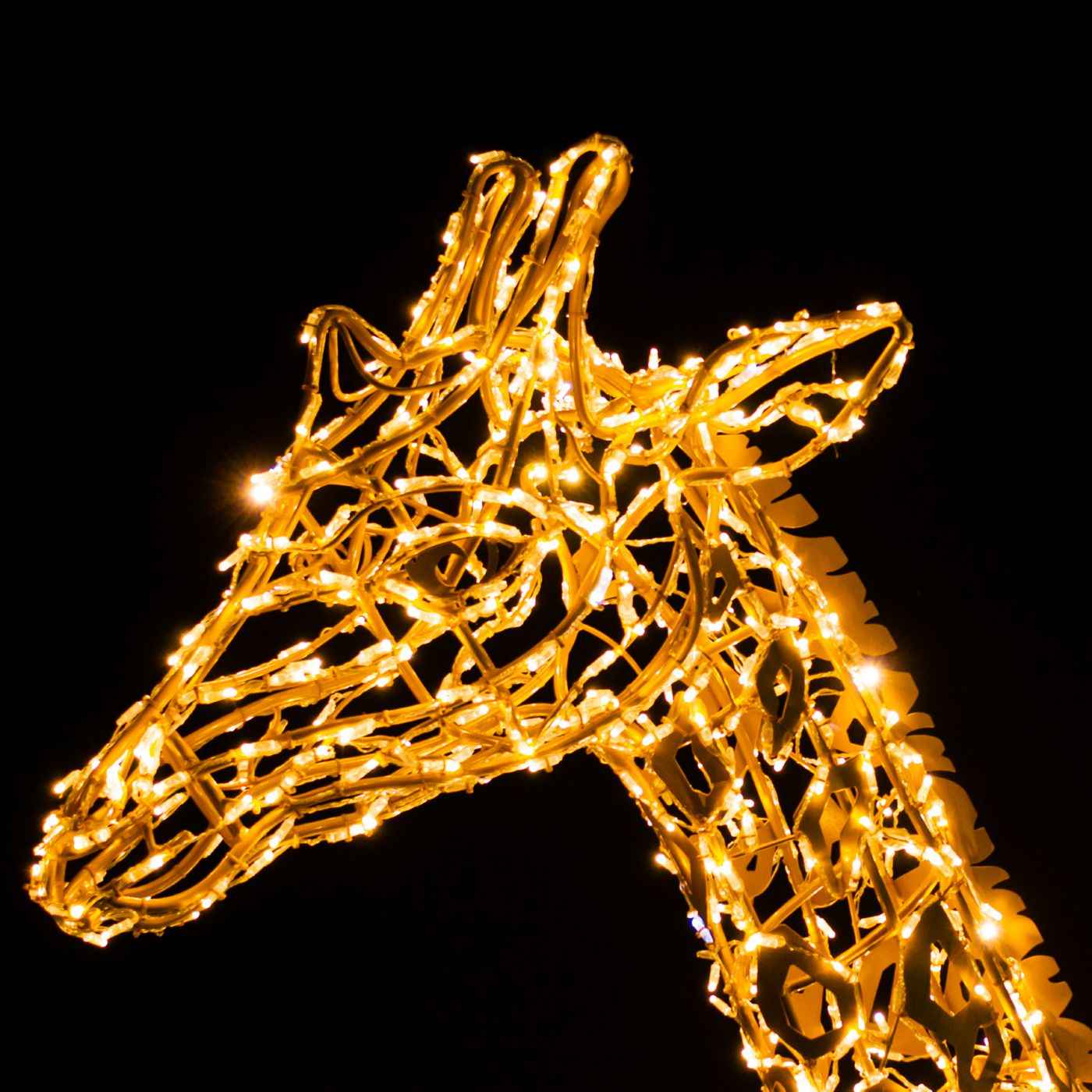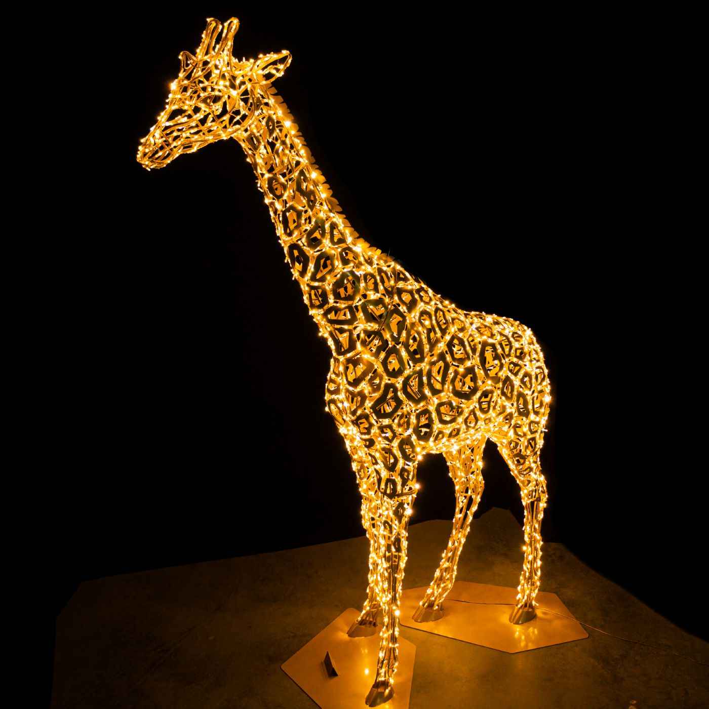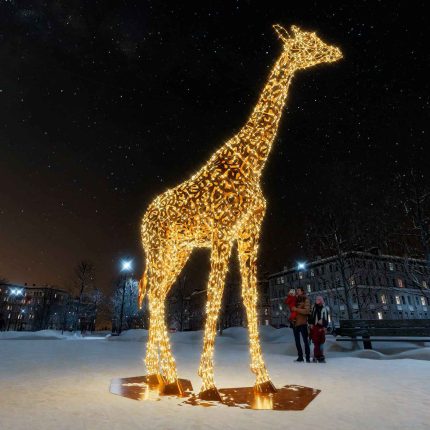 Фигура подходит для установки в любых общественных пространствах: от новогодней зоны у торгового центра до постоянной инсталляции в деловом квартале или городском парке. Она эффектна днём и особенно притягательна в тёмное время суток. Статная, спокойная и при этом уникальная — такой жираф станет магнитом для фото и внимания публики.