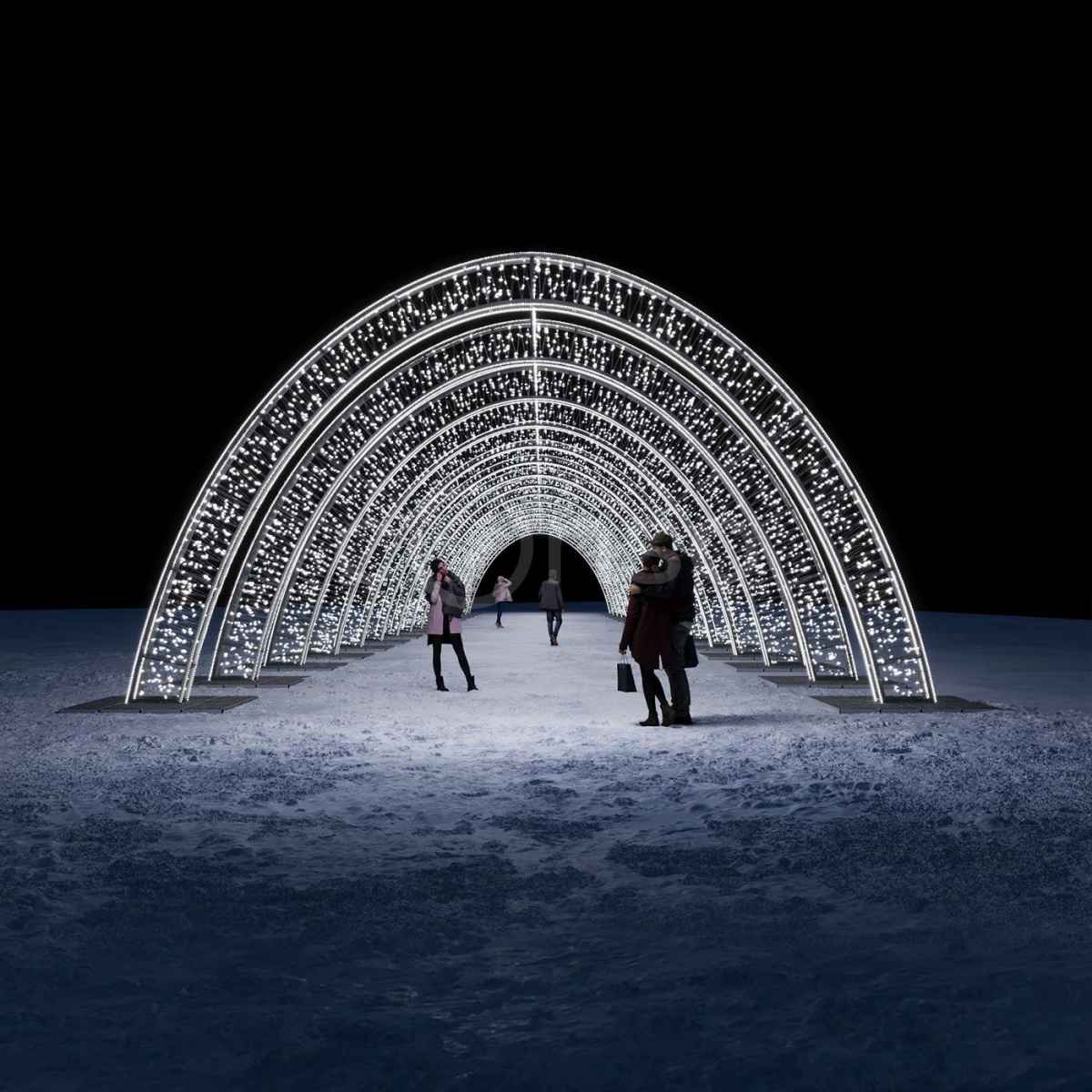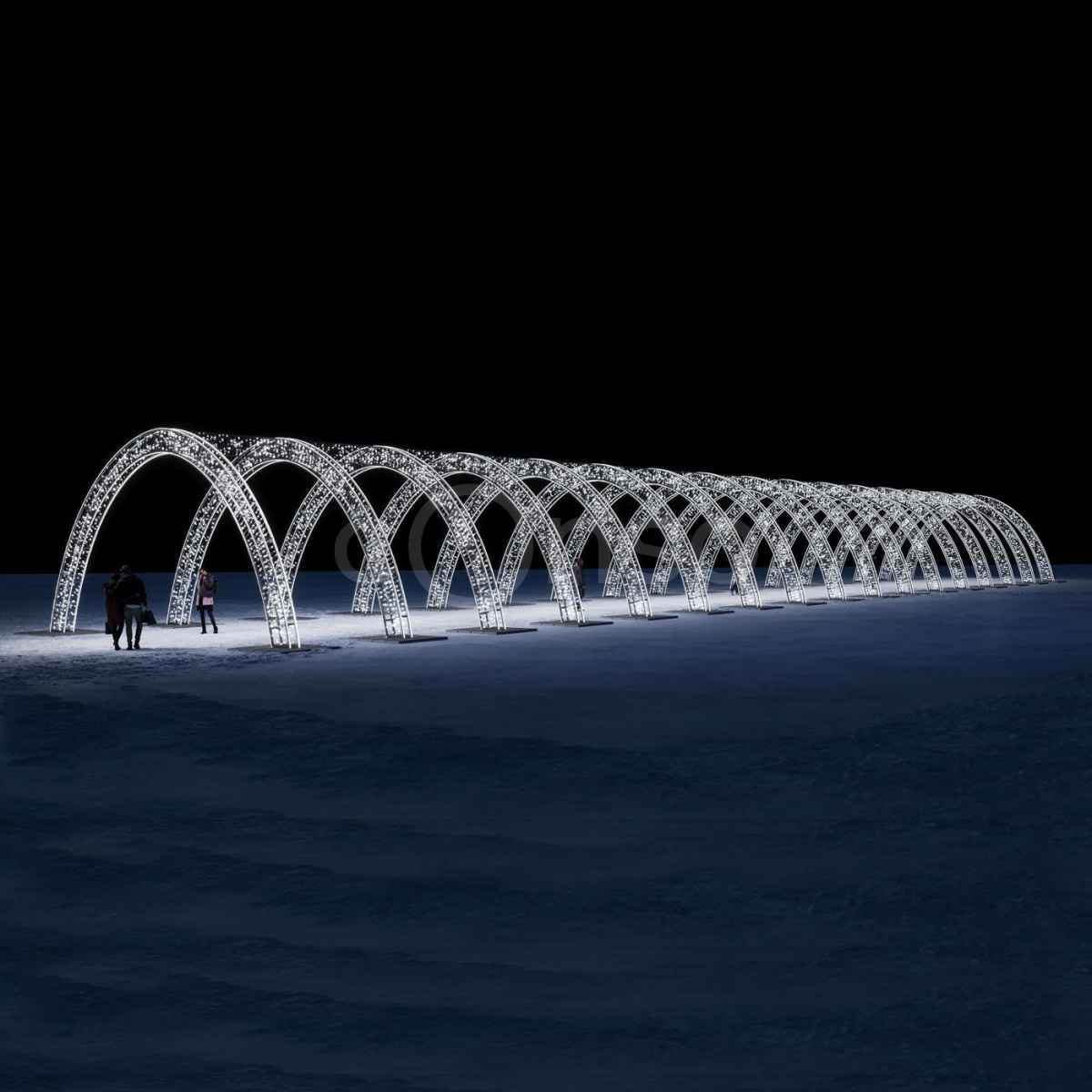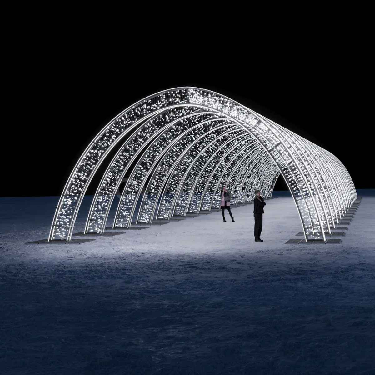 Световой тоннель из 17 арок — эффектный архитектурный элемент для городских улиц, парков, площадей и входных групп. Холодный белый свет, надёжный алюминиевый каркас и защита IP65 позволяют использовать конструкцию круглосуточно в любую погоду. Изготавливаем под заказ. Осуществляем доставку, монтаж и подключение под ключ в Москве и области.