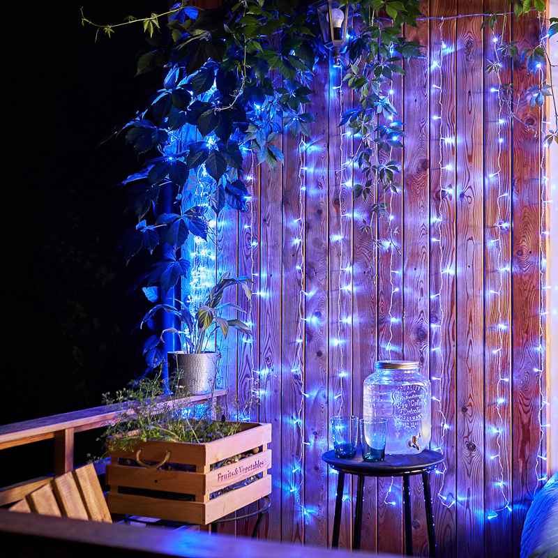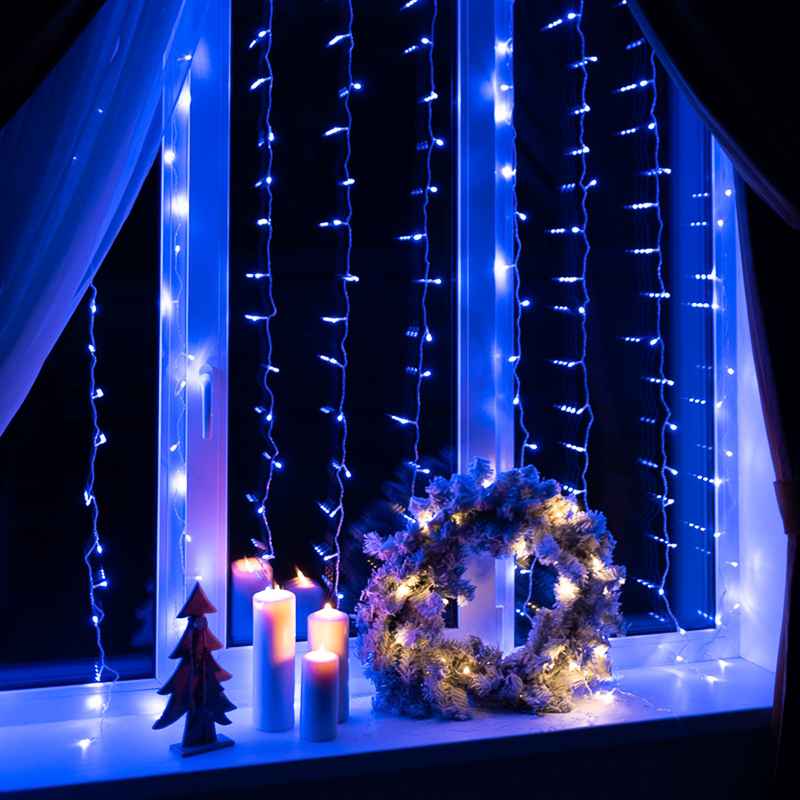 Гирлянда-занавес — это готовое решение для тех, кто хочет быстро преобразить помещение и создать атмосферу праздника. Размер 2.5×2 метра позволяет украсить большую поверхность: стену, окно, арку или целую фотозону. Синий свет подчёркивает торжественность и делает интерьер особенным, создавая эффект глубины и вечернего неба.