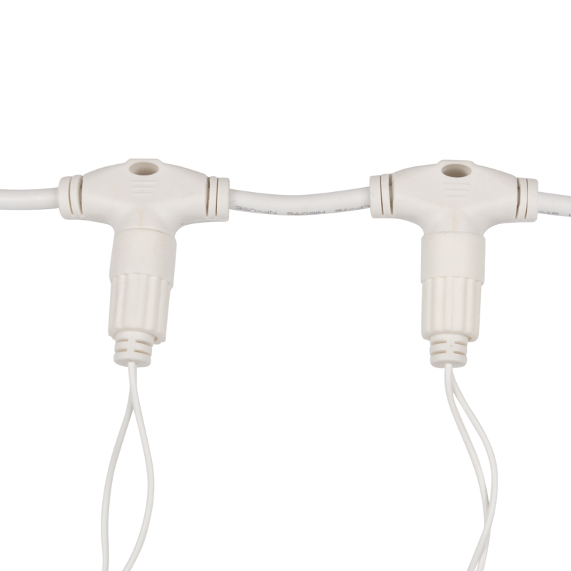 Белый ПВХ-провод делает гирлянду универсальной для фасадов, колонн и заборов светлых оттенков. В отличие от тёмно-зелёных проводов, он не выделяется днём и выглядит эстетично даже без подсветки. На фоне светлых стен и колонн белый провод практически незаметен, а ночью создаёт ощущение парящего свечения.