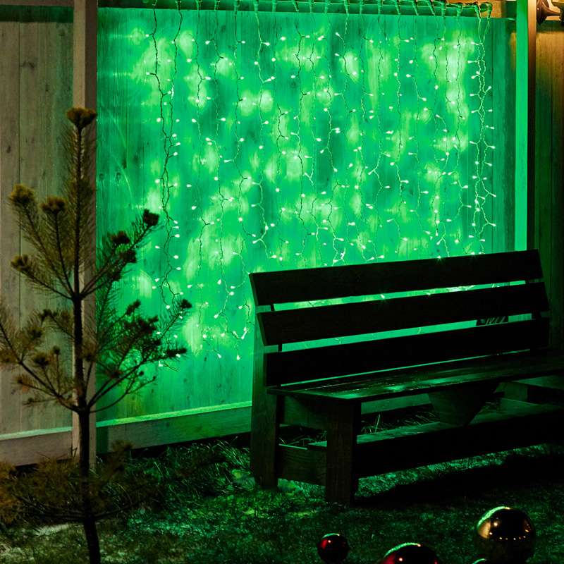 Гирлянда-занавес зелёного цвета с белым проводом подходит для множества сценариев:
