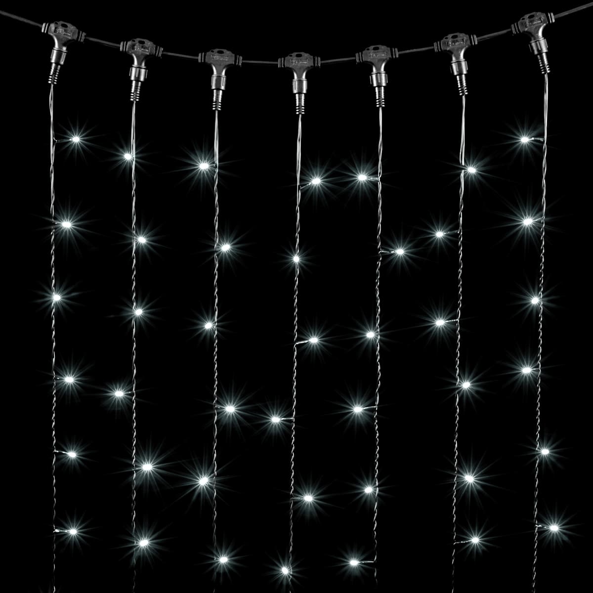 Белая гирлянда-занавес 2х2 м на чёрном проводе — универсальное решение для фасадов, заборов и колонн. 400 ярких светодиодов равномерно распределены, создавая плотное сияние. Защита IP54 позволяет использовать её на улице и в помещениях. Несколько гирлянд можно соединить в единую цепь до 20 метров.