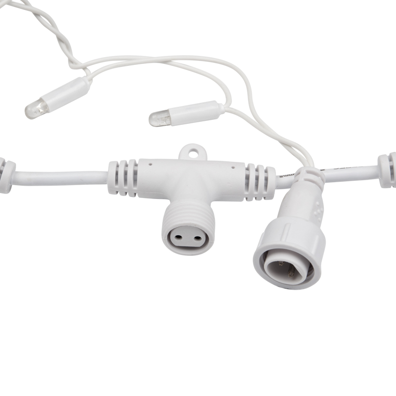 Белый провод гармонично сочетается с фасадами светлых тонов, зимними композициями и снегом. Днём гирлянда выглядит аккуратно и почти незаметно, а вечером — превращается в яркое сияющее полотно. Этот эффект особенно востребован для оформления коттеджей, гостиниц, торговых центров и банкетных залов.