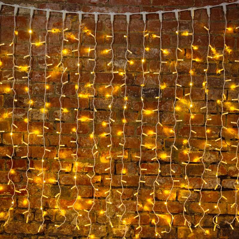 Профессиональная гирлянда-занавес 2×3 м с тёплым белым свечением и эффектом мерцания создаёт уютную праздничную атмосферу. 600 ярких LED, влагозащита IP65 и морозостойкость до –25°C позволяют использовать её на улице и в помещении. Белый ПВХ-провод гармонично вписывается в светлые фасады и конструкции. Возможность соединения до 3 гирлянд делает модель удобной для масштабных проектов.