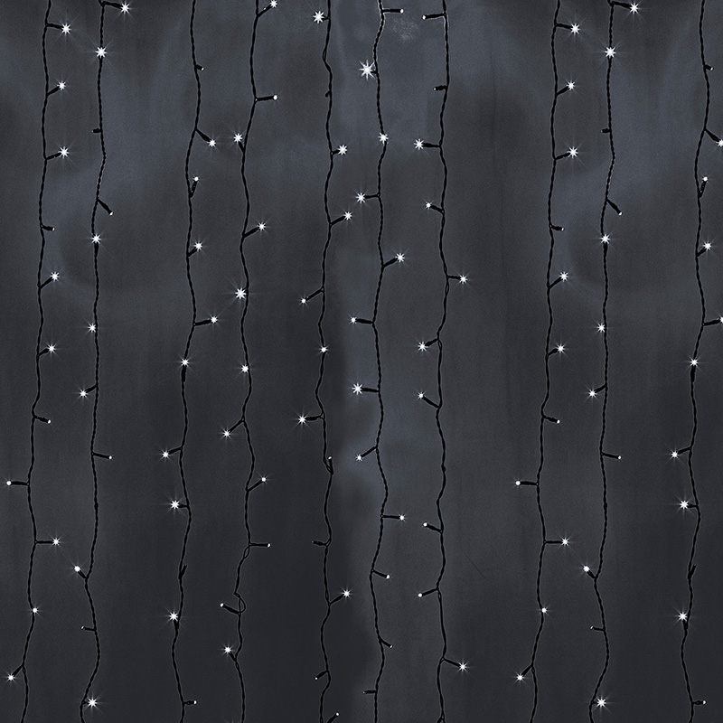 Гирлянда-занавес размером 2×9 м с эффектом «водопад» — это мощное, плотное и равномерное свечение, которое впечатляет с первого взгляда. 2200 светодиодов белого свечения создают эффект струящегося света, имитирующего падение капель, что особенно эффектно в вечернее время и на больших площадях.