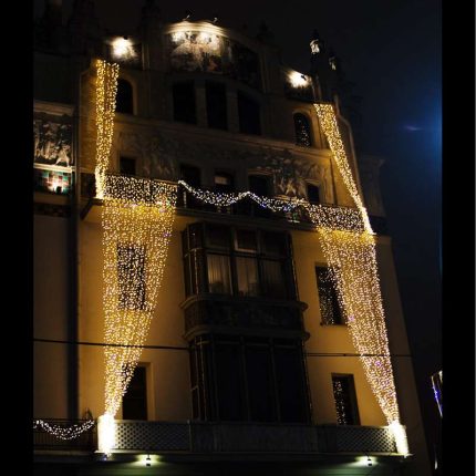 С гирляндой-занавес 2×9 м в тёплом белом свете вы получите надёжное, стильное и долговечное оформление, которое будет радовать гостей и прохожих каждый день, в любую погоду.