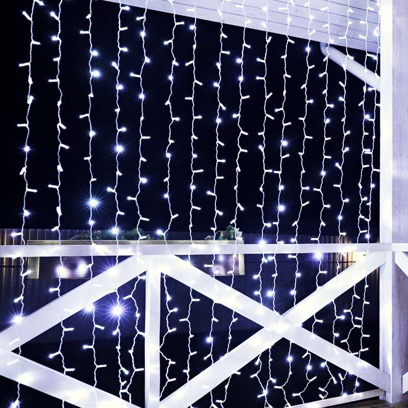 Профессиональная гирлянда-занавес 2×3 м с ярким белым статическим свечением и прозрачным ПВХ-проводом. 448 LED, защита IP65, ресурс 30 000 ч, соединение до 4 занавесов. Для фасадов, витрин и интерьеров.
