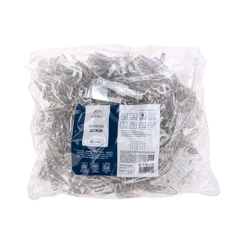 В модели установлено 448 ярких светодиодов, равномерно распределённых по 16 вертикальным нитям. Такое расположение обеспечивает плотное заполнение светом, без провалов яркости, что особенно важно для фотозон, витрин, входных групп и фасадов зданий.