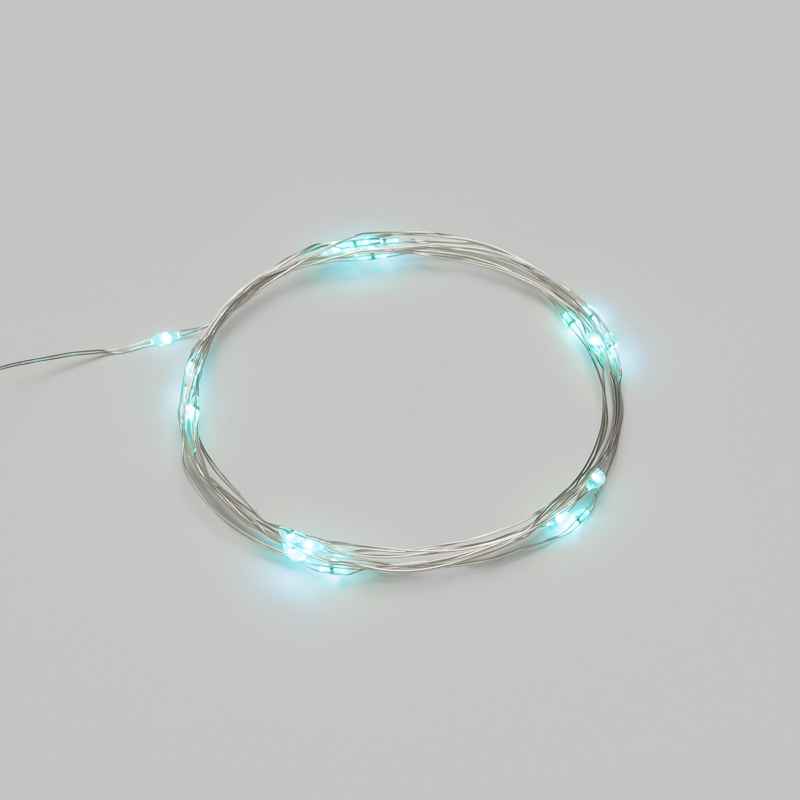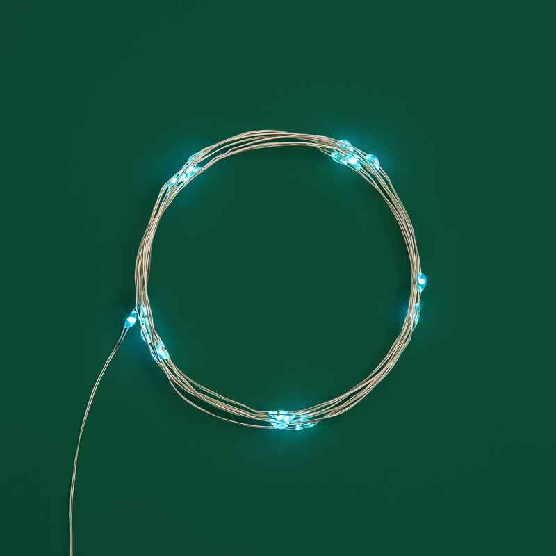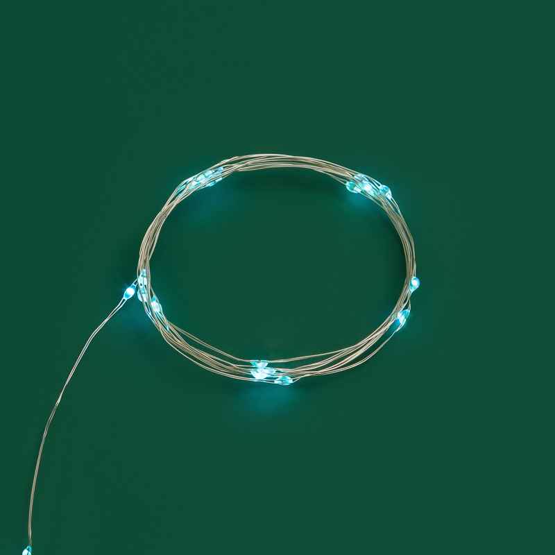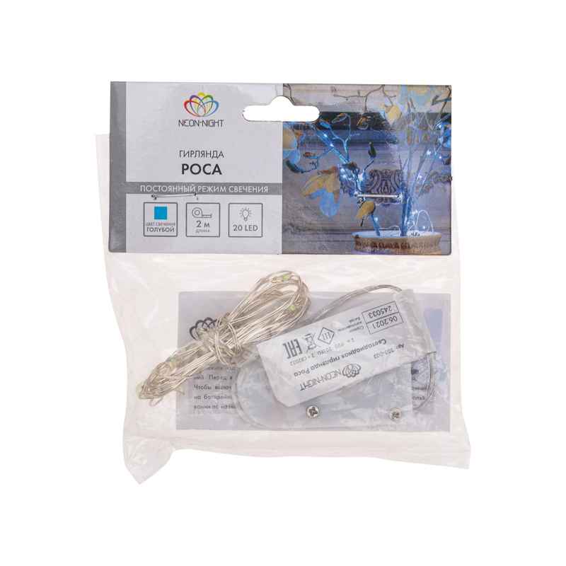 Гирлянда-нить «Роса» длиной 2 м с 20 светодиодами голубого цвета создаёт свежий и воздушный световой акцент. Питание от батареек позволяет разместить её где угодно — без проводов и розеток. Серебристый металлический провод практически незаметен в декоре. Отличный выбор для украшения ёлок, интерьерных композиций, фотозон и праздничного оформления помещений.