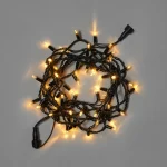 Уличная гирлянда с тёплым белым светом и каучуковым чёрным проводом. Длина 10 м, 100 диодов, защита IP65. Надёжное решение для деревьев, перил, елей и фасадов.