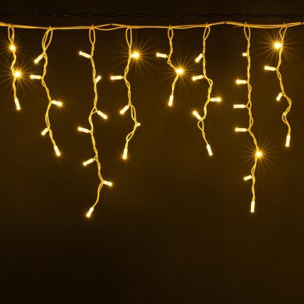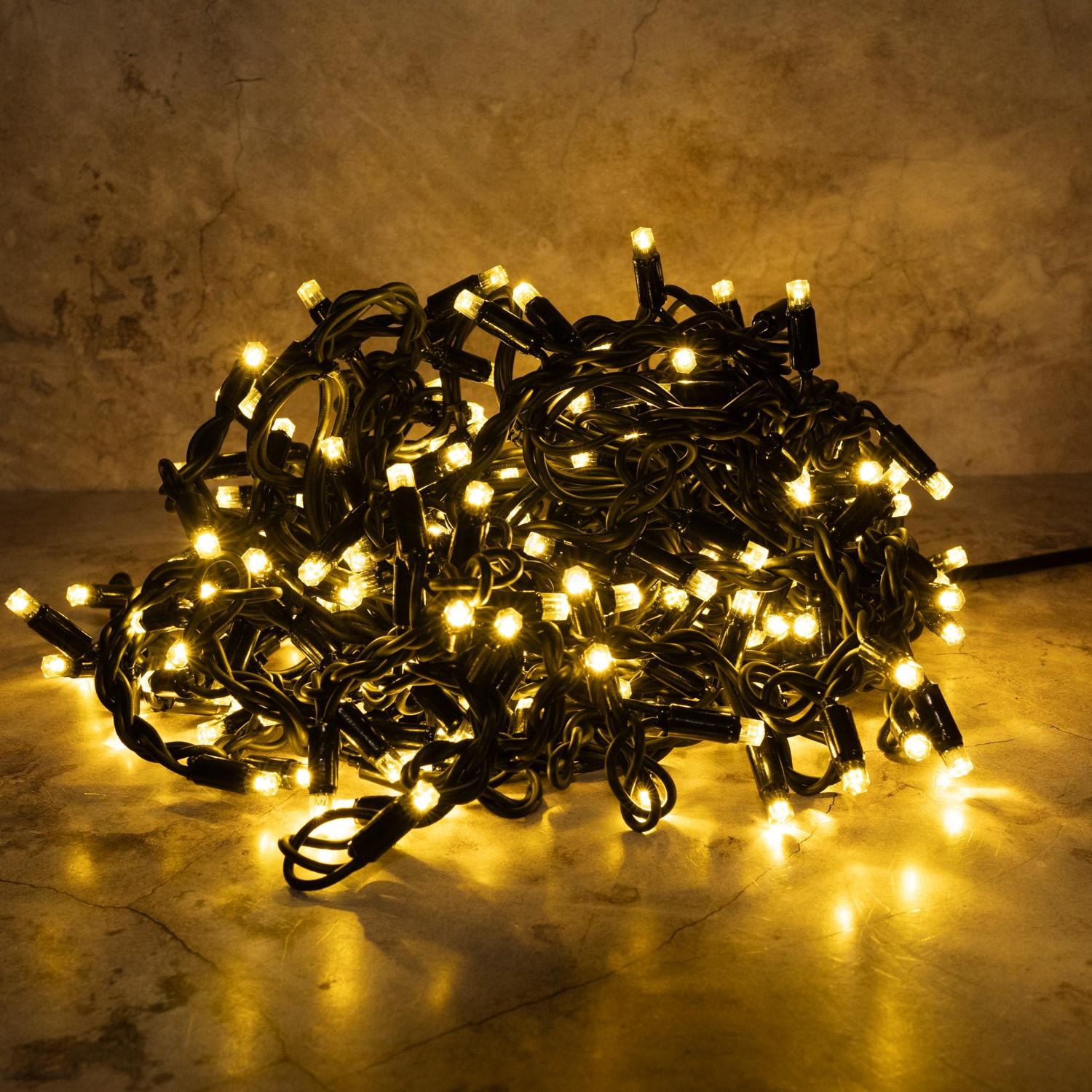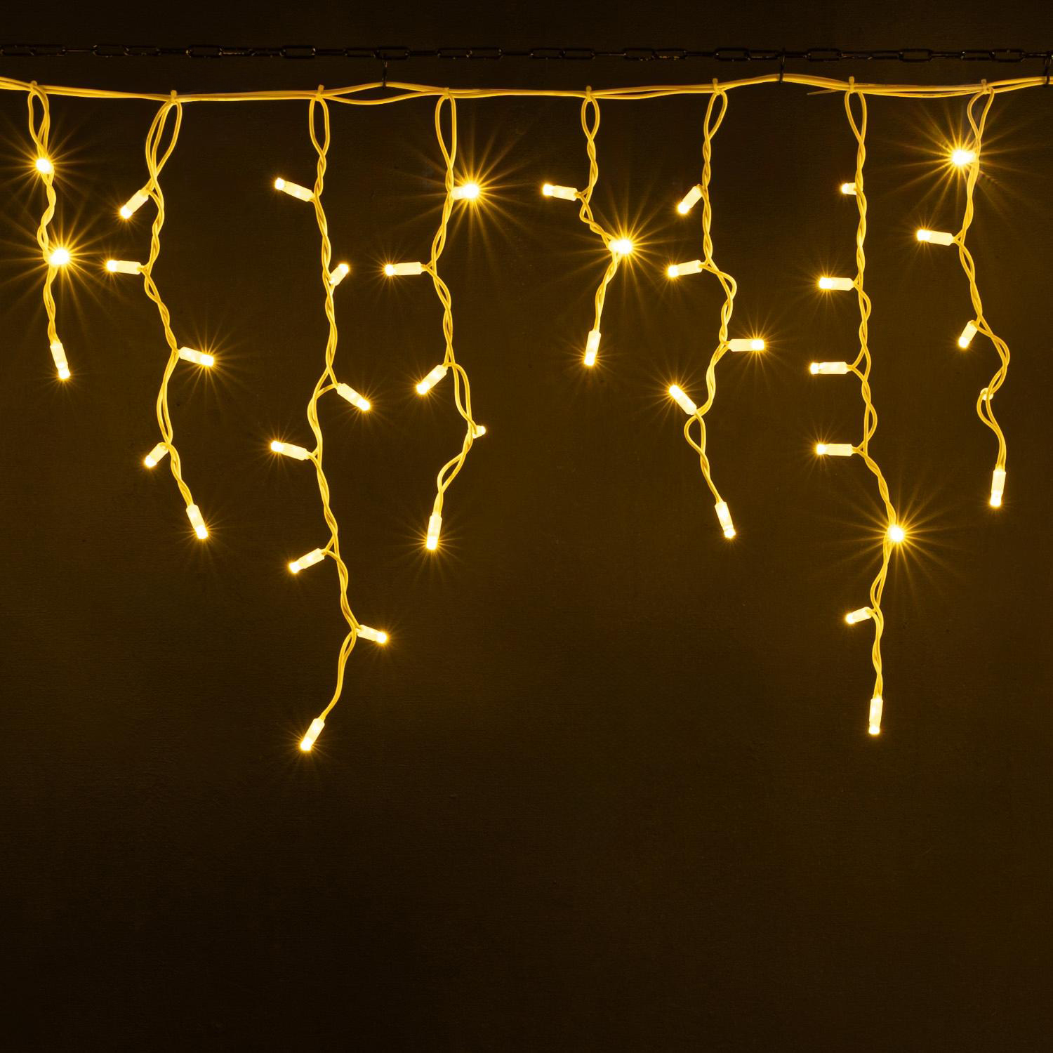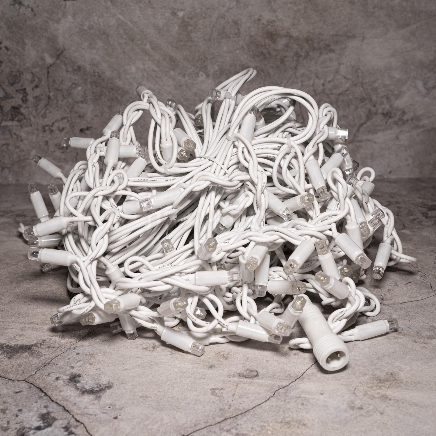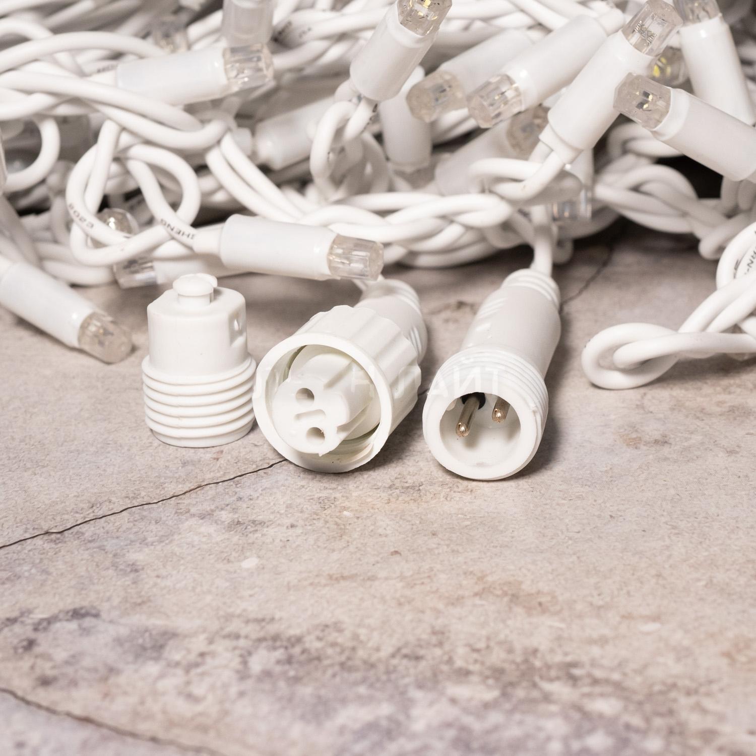 Гирлянда с ровным тёплым светом для подсветки фасада, забора или кровли. Провод белого цвета, защита IP65, подключение в комплекте. Подходит для улицы и домов со светлым фасадом.