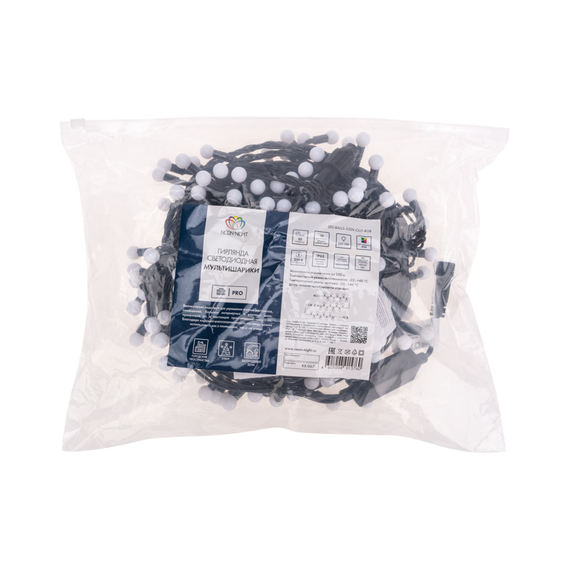 Яркая гирлянда с миниатюрными RGB-шариками (13 мм) и эффектом быстрой смены цвета. Длина 20 м, 200 светодиодов, защита IP65. Подходит для улицы: деревья, заборы, перила, колонны. Один динамический режим. Питание 230 В.