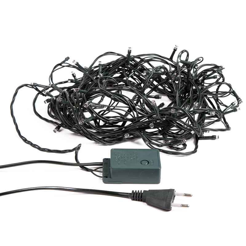 Длина провода — 20 м + 3 м питающего шнура. Это позволяет подключить гирлянду без удлинителей и свободно оформить даже крупные объекты. Питание — от розетки 230 В.